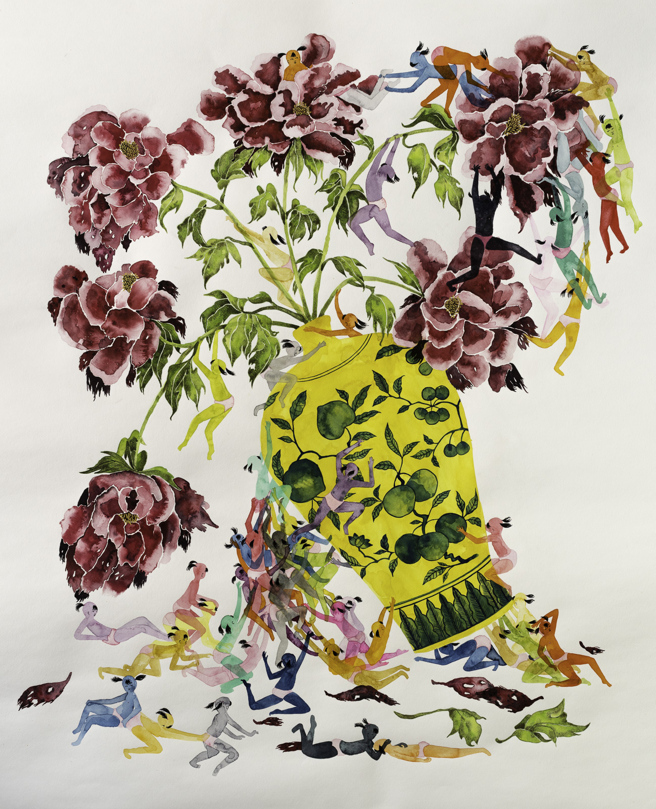 Like Alice eagerly hoisting herself into the opening of the rabbit hole, the characters in Megan Bogonovich’s ceramic sculptures appear to be the protagonists of fantastical adventures. The anachronistic, well-heeled women climb into elaborate sea anemones and coral reefs in a bizarre clash of nature and civilization. The sea anemones are enormous compared to the tiny humans; the structures’ different layers stack up like the elaborate architectural designs of storybook castles. With their pastel colors and ornamental details, the underwater creatures seem to make suitable homes for the ladies in A-line skirts and kitten heels, as bizarre as it may seem.