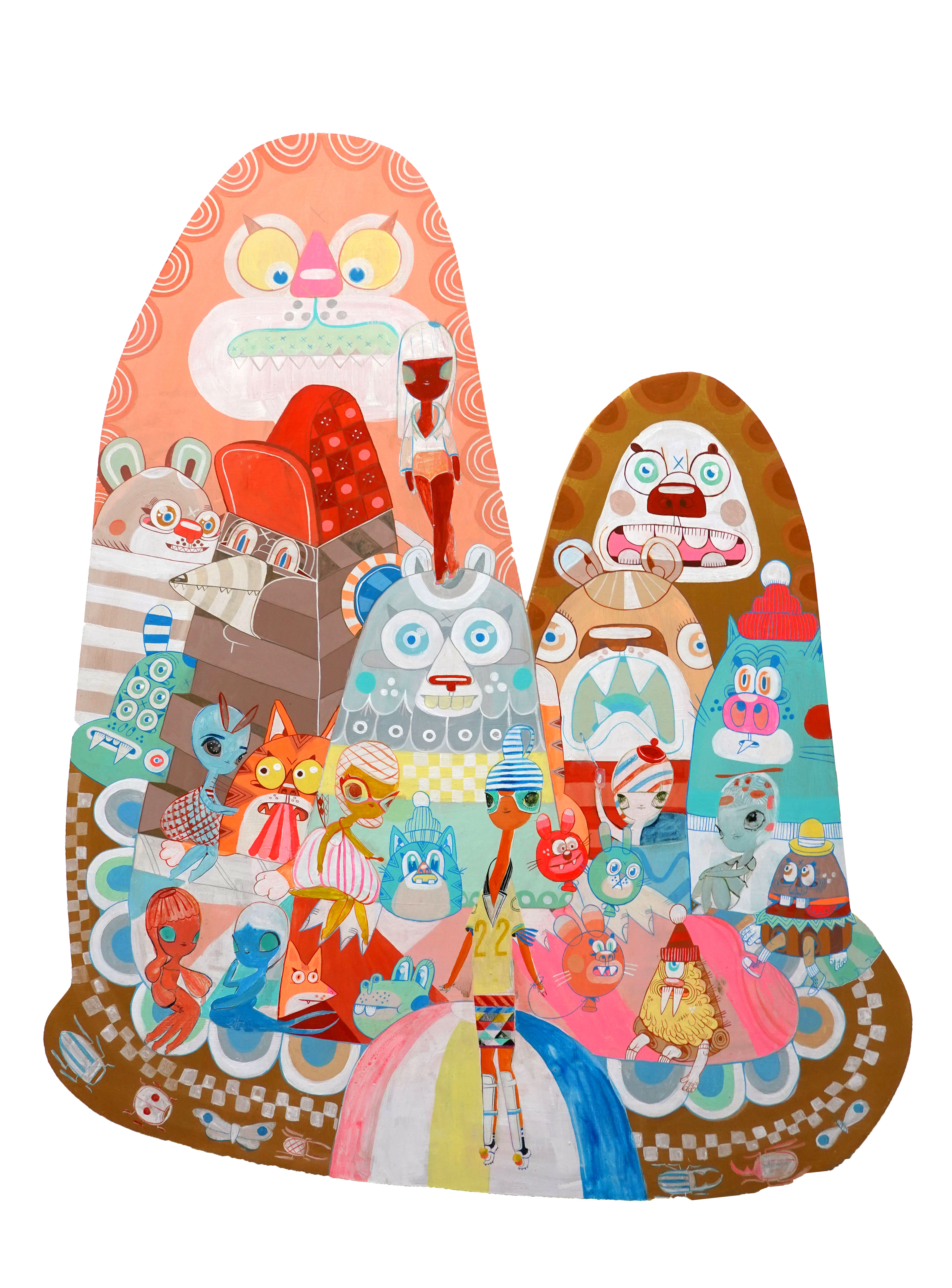 “Floating World” takes its name from the iconic Japanese wood block prints and paintings called Ukiyo-e from the Edo Period. In the Edo Period, Ukiyo (which translates to “floating world”) was a new term coined to describe the wealthy merchant class’ pleasure-seeking ways — their indulgence in theater, fashion, courtesans and the like. KeFe chose this title as an homage to Japanese culture and history, which they cite as a big influence. While Japanese imagery is present in these new paintings, the artists create their own interpretation of a “floating world”: a calm, placid place where human and animal characters mingle and anything is possible.