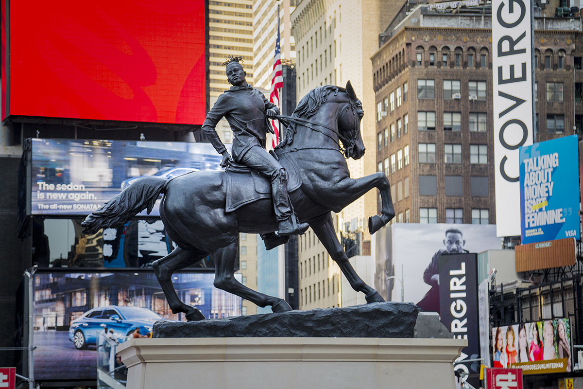 Kehinde Wiley’s larger-than-life paintings (featured in HF Vol. 29) insert black and brown individuals into the typically all-white history of Western portraiture. His subjects, a majority of whom are urban males, are cast in poses that assertively beckon old master paintings of European kings and emperors. Some gallantly ride horses, while others don regalia. All figures peer commandingly at the viewer in Wiley’s 14-year survey “Kehinde Wiley: A New Republic” currently on view at the Brooklyn Museum.