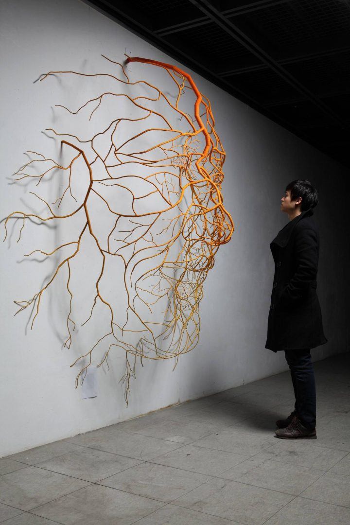 Using painted resin, wood, and metal, New York-based artist Jiannan Wu’s recent relief sculptures feature scenes ripped from urban environments. The artist often plays with perspective whether it’s his distorted “Selfie” series or a visit to the city’s subway backdrops. A statement says that Wu is always considering multiple dimensions in his work.
