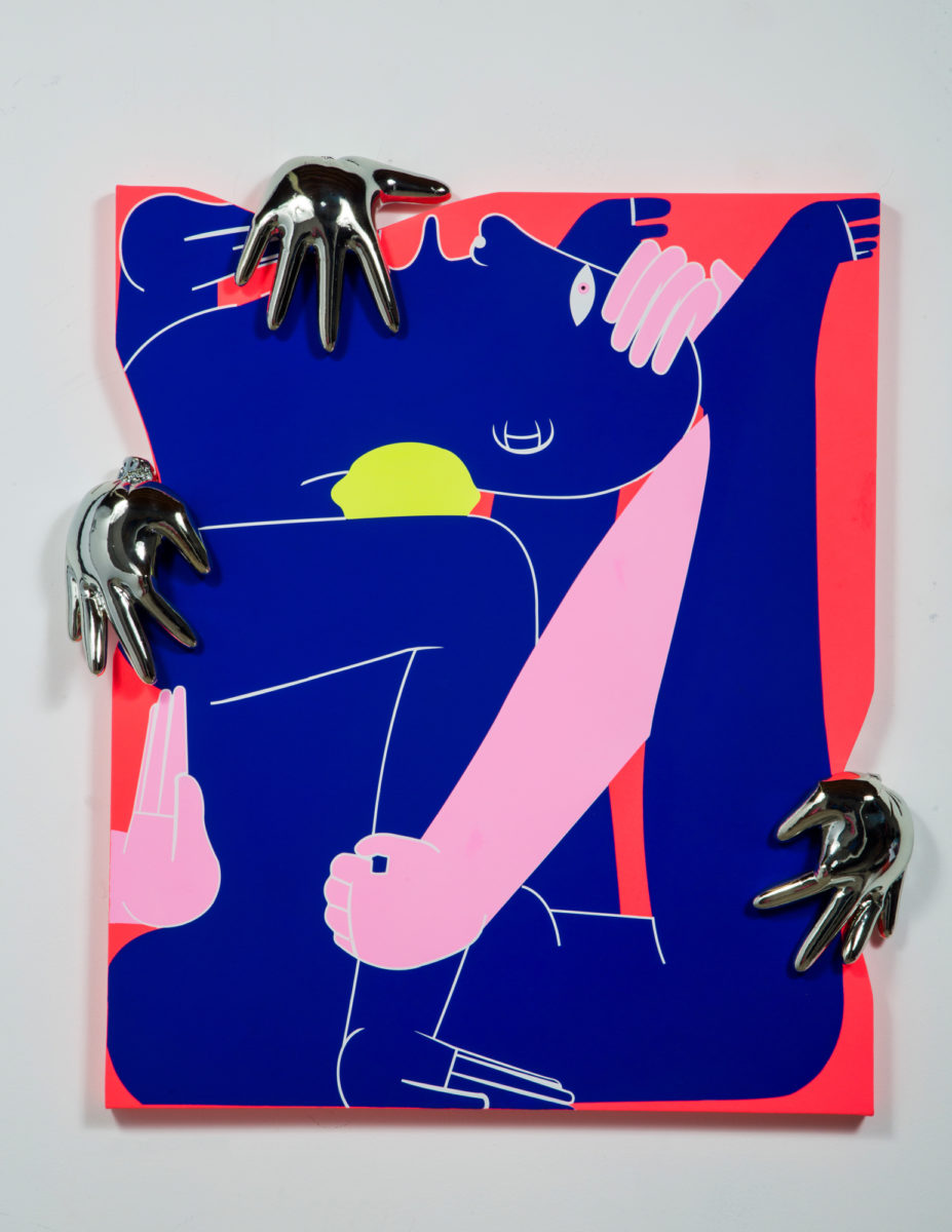 “He paints his subjects’ bodies surrounded by their possessions and domestic environs, while disguising their skin colors and features,” a statement says. “Fallah’s work is of analogously global ancestry, influenced by the pattern and detail of Persian miniatures, the portrayals of class and domestic life of 17th century Dutch art, and the brashness and saturation of American visual culture. He often uses shaped canvases, referring to portraits in various contexts, such as a locket or stained glass.”