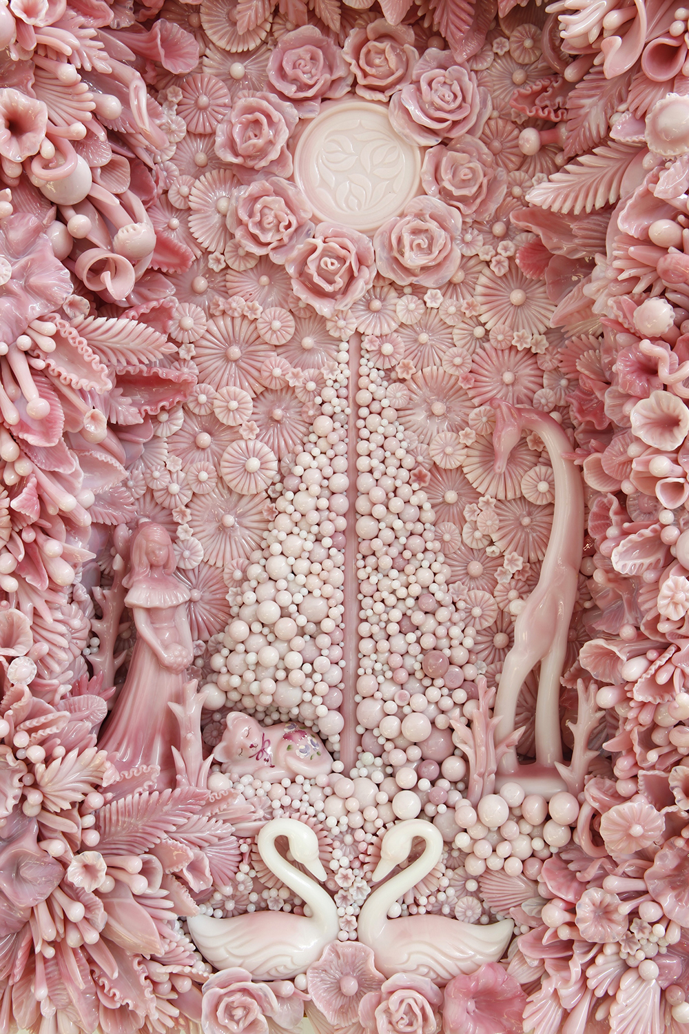 “[Her] work asks universal questions about rebirth, knowledge, desire and the transformative powers of labor and imagination,” a recent statement says. Her pieces are made by re-working pressed glassware produced by some of the best known, but now-defunct, American glass factories. Simultaneously patriotic and subversive, Cowan’s objects explore the texture of material seduction and recount the history of US glass manufacturing; tracinging its rise, glory and demise and its influence on society.”