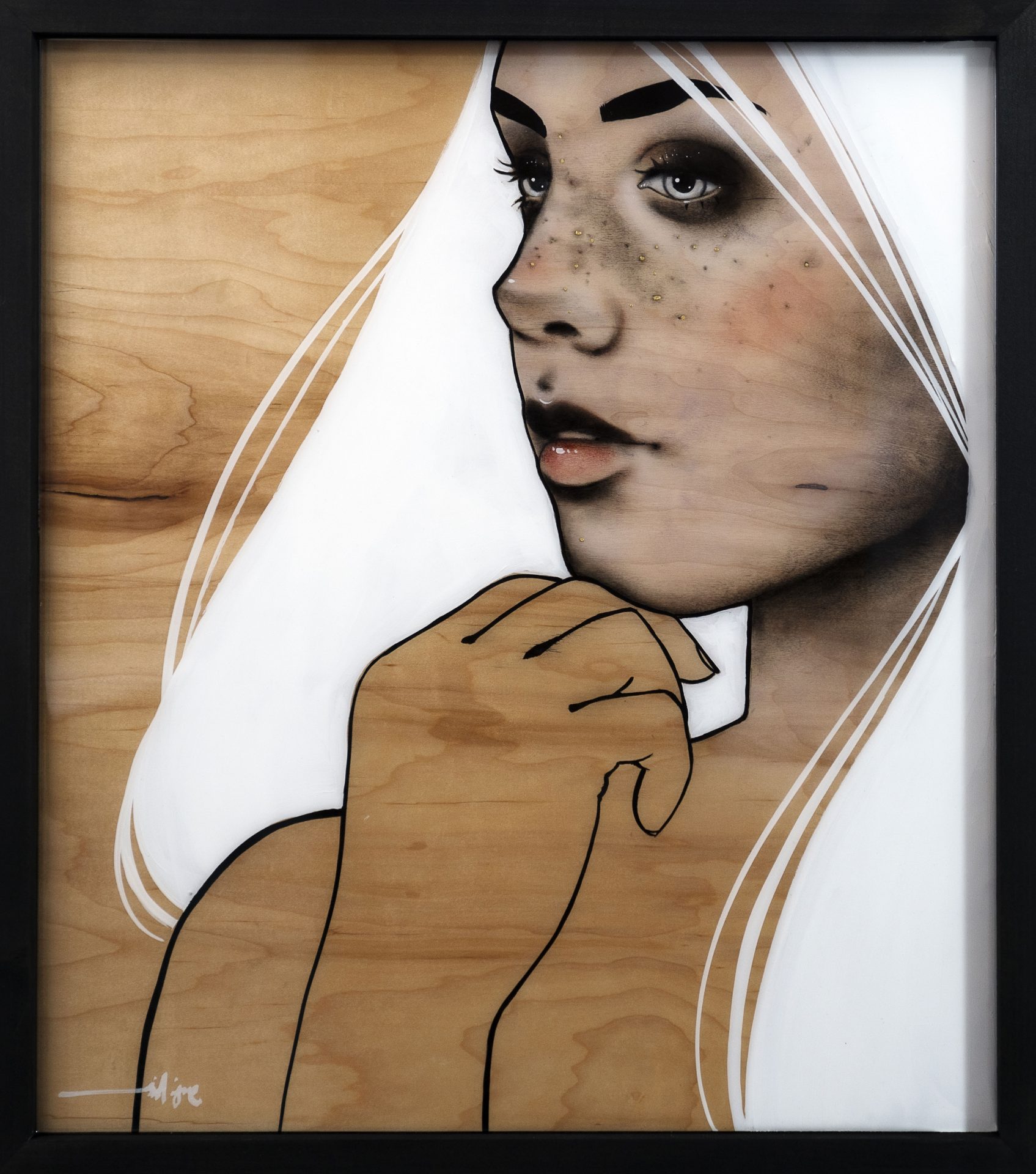 “24k features a body of work that looks back at the viewer,” the gallery says. “Returning to us with his signature style, David Santiago creates an intimate exploration of one’s own value and inner beauty. The subjects in his show are adorned with 24k gold leaf freckles, toying with the idea of how we view our ‘blemishes.’”