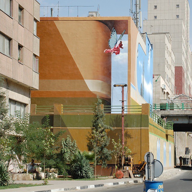 “Known primarily for his gigantic trompe l’oeil-style murals in central Tehran, Ghadyanloo also creates paintings, with surreal and minimalistic themes,” the artist’s site says. “Through his works, Ghadyanloo opens a window into the mood of life in Iran today. At the same time, he provides an autobiographical perspective, portraying the landscapes of his youth, his memories of Iran-Iraq war (1980-1988), and his life experience in the Islamic Republic. Although at times sombre and even suggestive of a failed utopia, Ghadyanloo’s work conveys hope that change can be effected, and it speaks with joy of what remains glorious in gloomy times.”