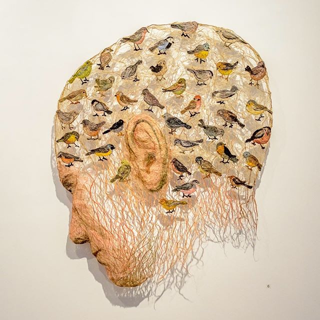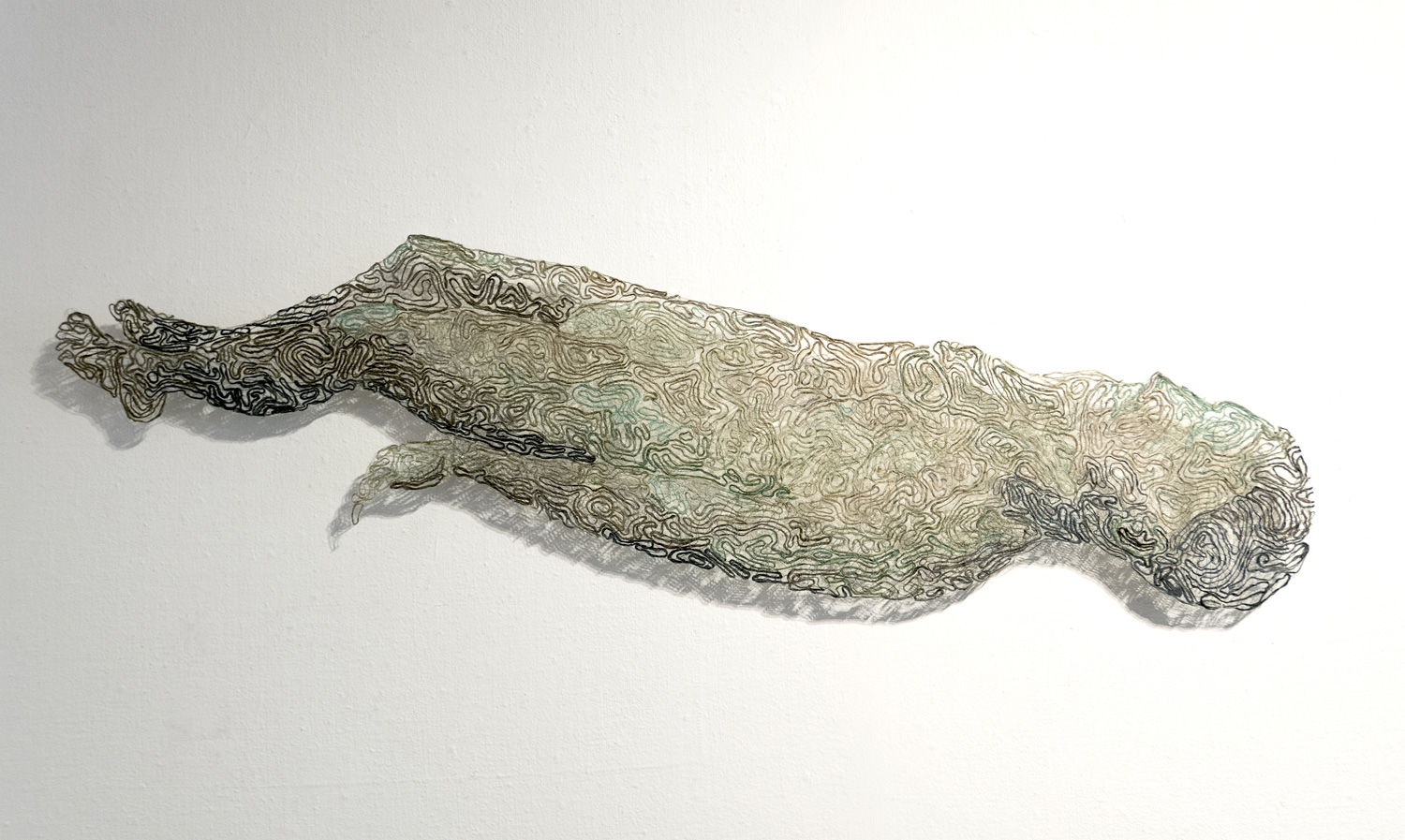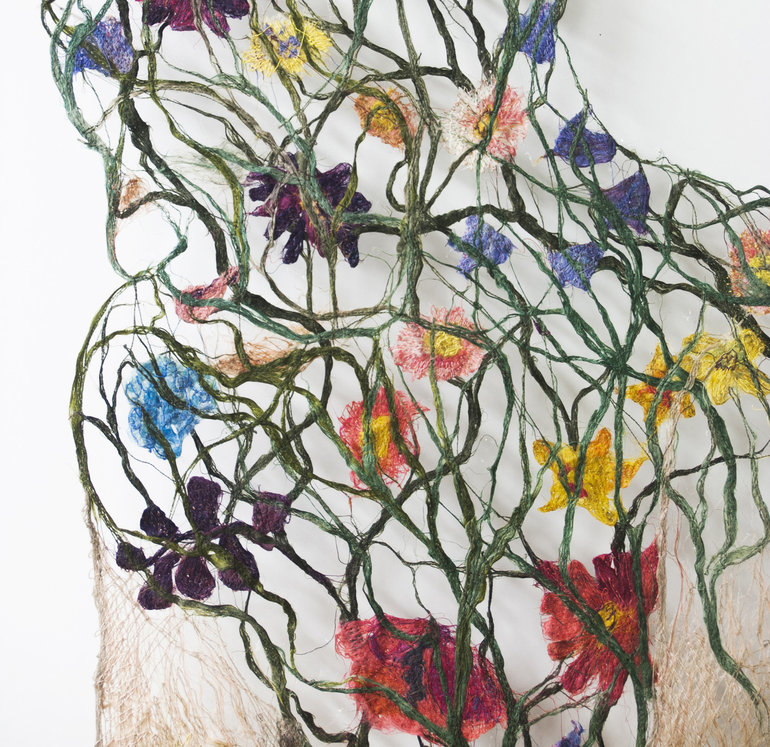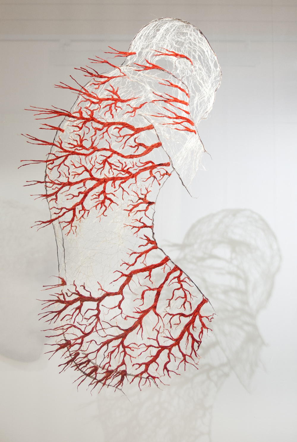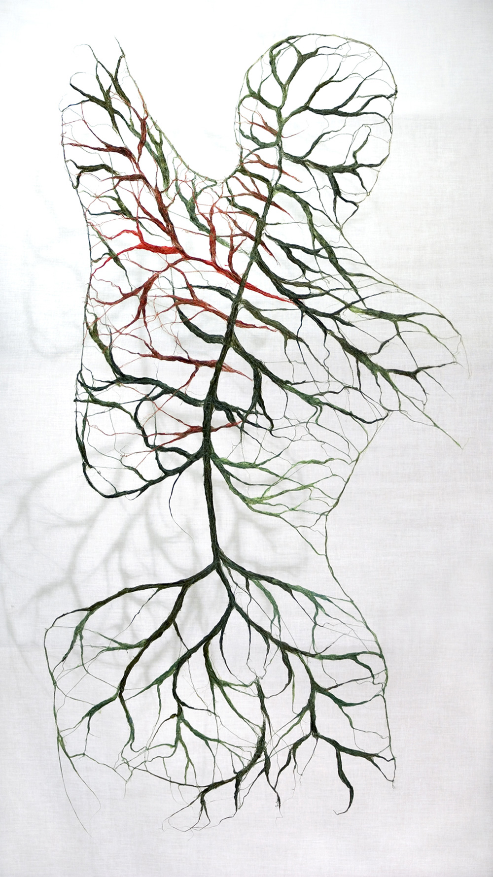 Raija Jokinen reassembles aspects of the human bodies with flax. The Finnish artist interweaves creatures and notes of nature into her recreations of our interior. Jokinen considers her work to exist at the “meeting point of the techniques in painting, graphic art, hand made paper and textile.”