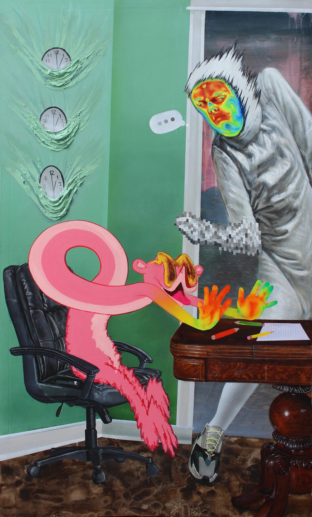 “In my work I try to compress all my experiences and interests onto the canvas,” the artist has said. “Casinos, parties, the backseat of Uncle Sticky’s limo and other over the top hotspots are explored and inhabited by a cast of characters from some of my favorite movies, cartoons, and internet memes. These characters are often lost in the moment, and too caught up in their own lives to notice the viewer watching them. My paintings are kind of assemblages of everything I like into cohesive scenes where cartoons are real and reality is distorted.”