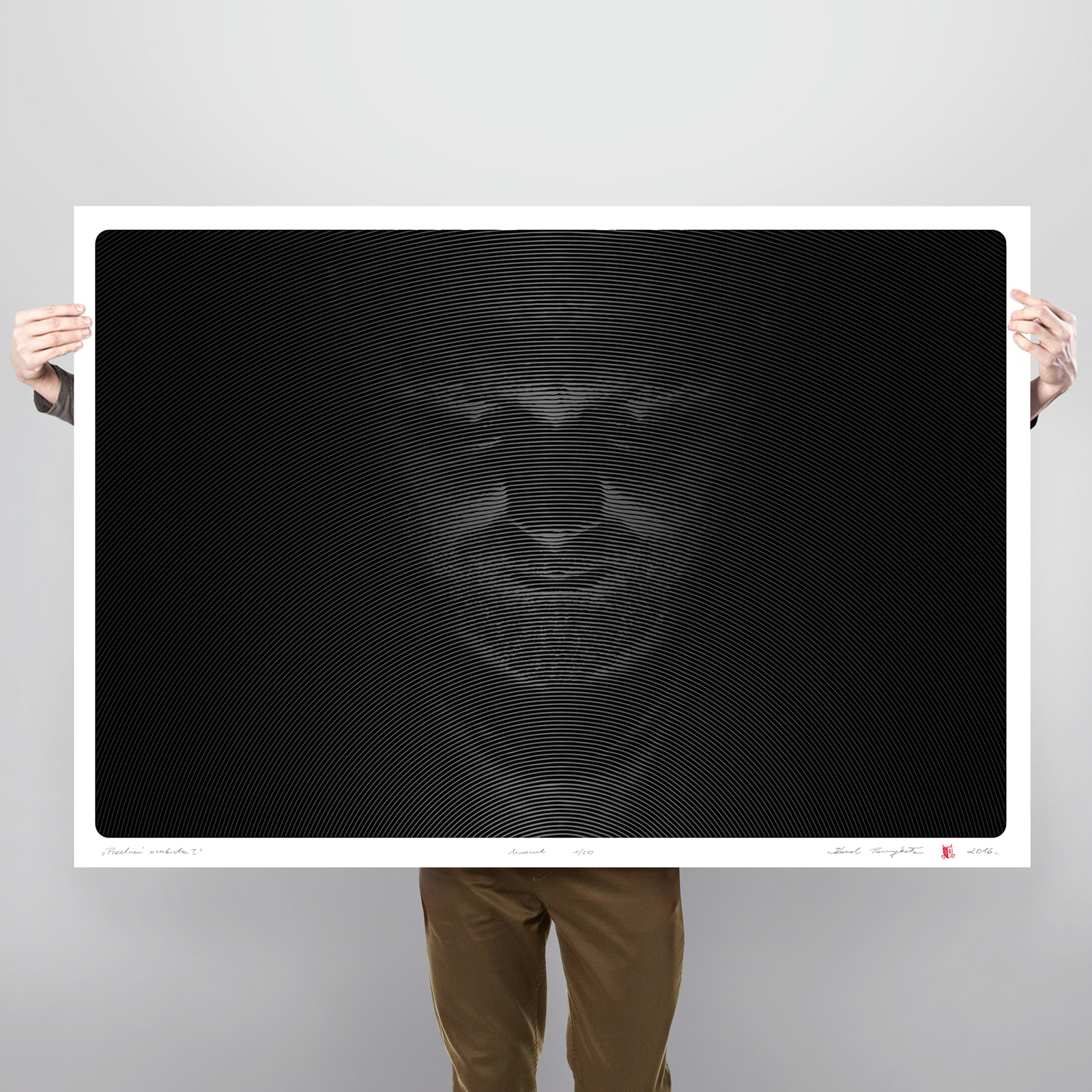 “The installation ‘One Direction’ consists of a classic linocut print and contemporary technology represented by the virtual reality. It is a contradiction between the actual and the virtual, transposition of two-dimensional analogue print into three-dimensional computer generated world. The installation consists of two elements. The first one is graphics, large format linocut in size 140 x 400 cm. The second one is VR set with a stereoscopic animation. The picture you see in VR is an extension of large format linocut, exposed on the wall.”