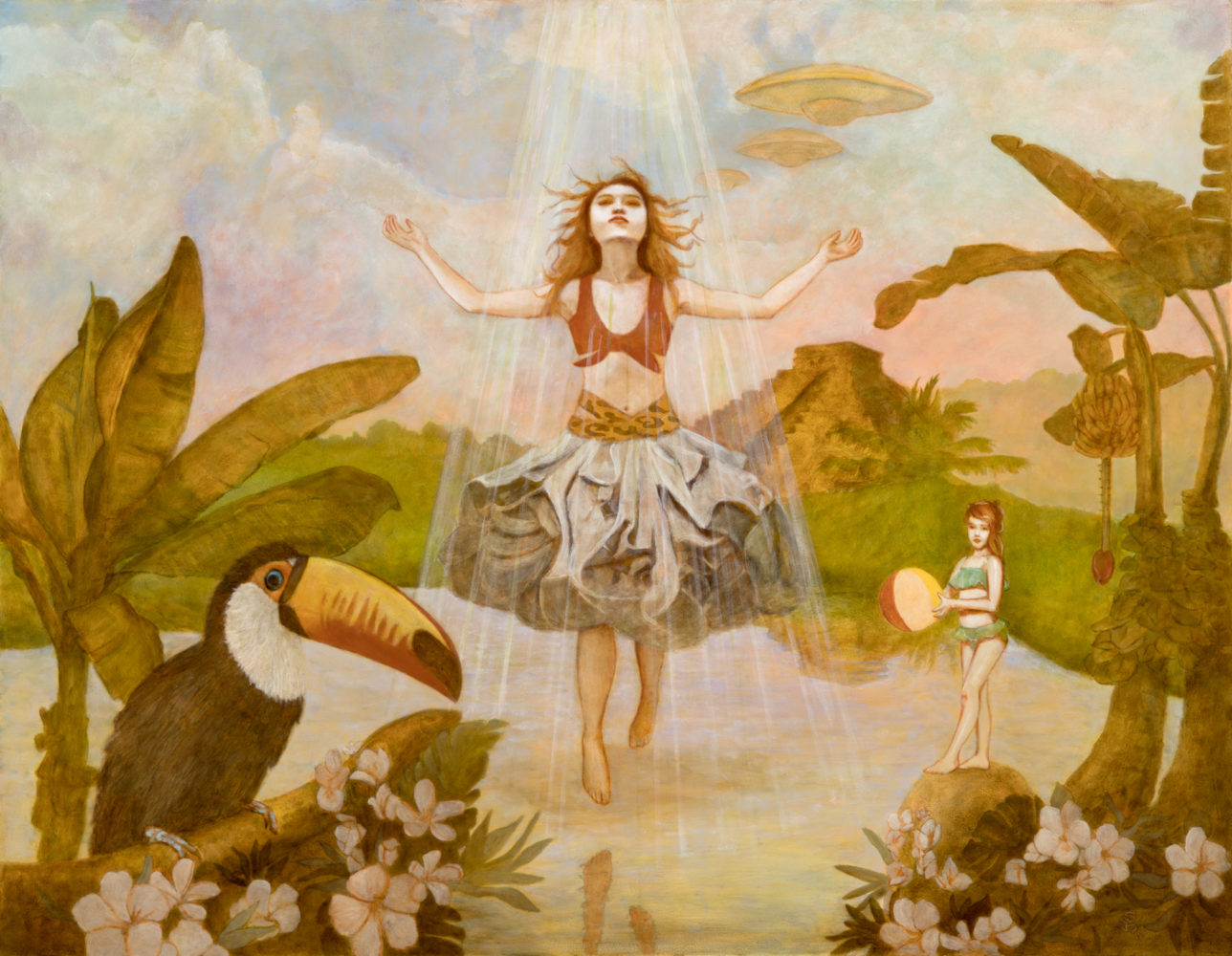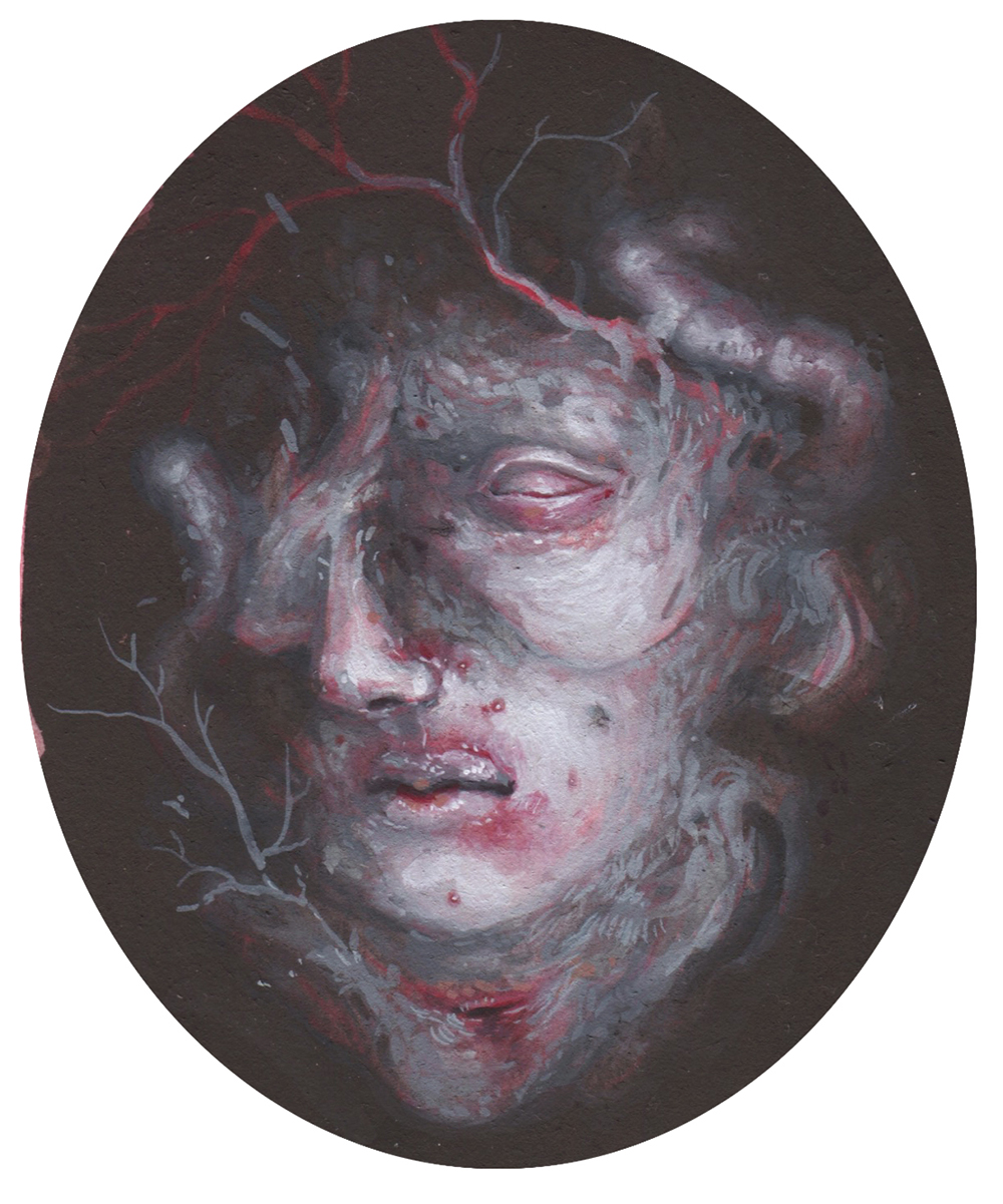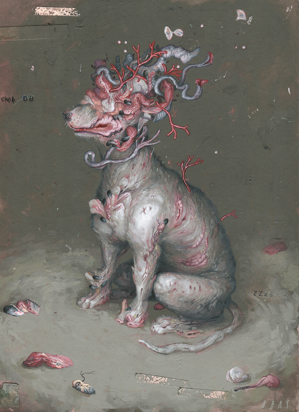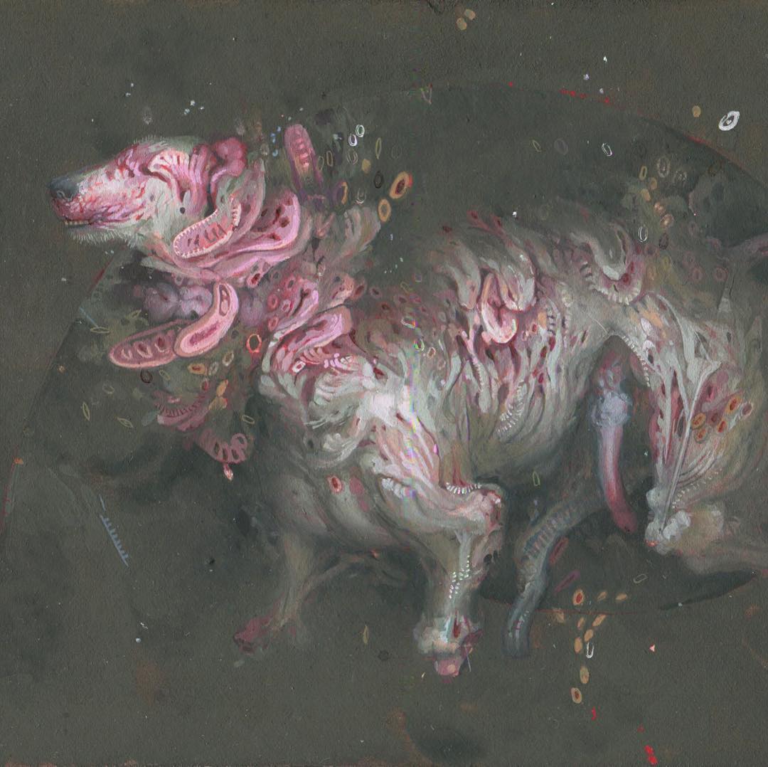 In recent work, there’s an ever-evolving horror and beauty in the paintings of Allison Sommers. Pieces created for shows at galleries across the U.S. range in size and subjects. Below, see how she’s recently depicted an unraveling canine, the human body, and other bits and organs worthy of close observation.