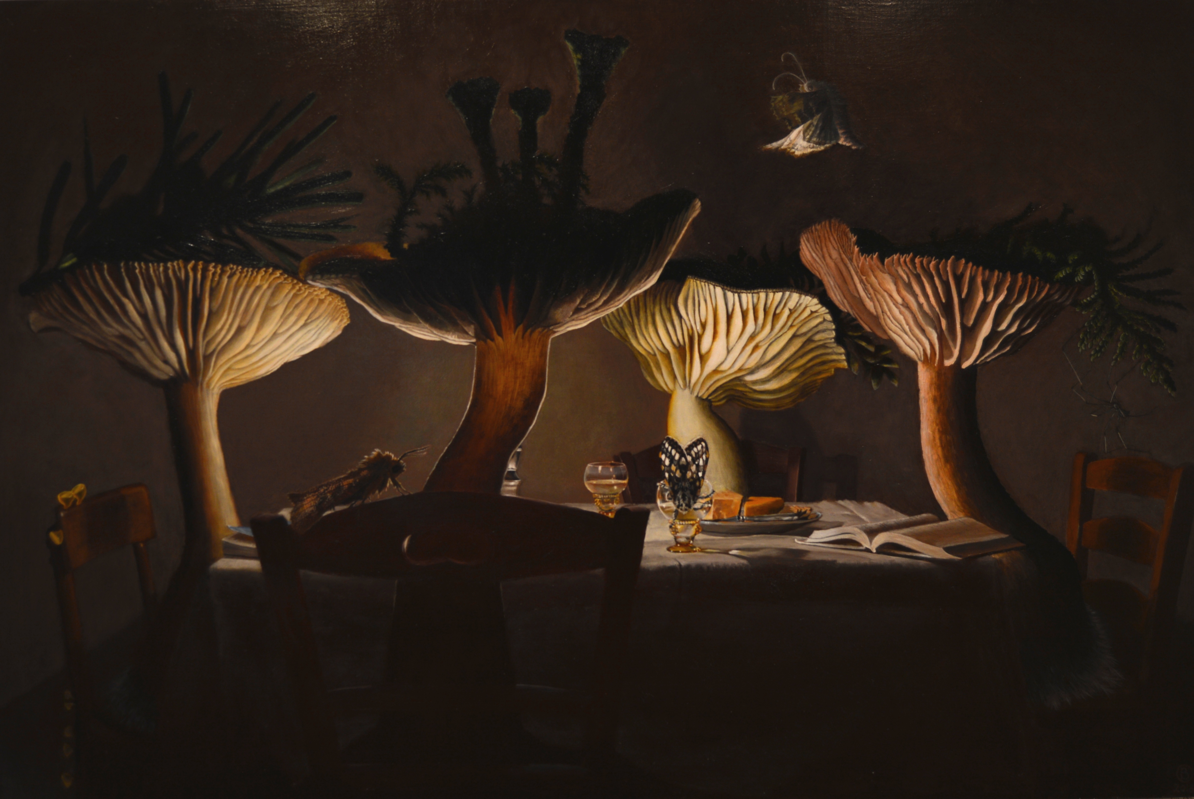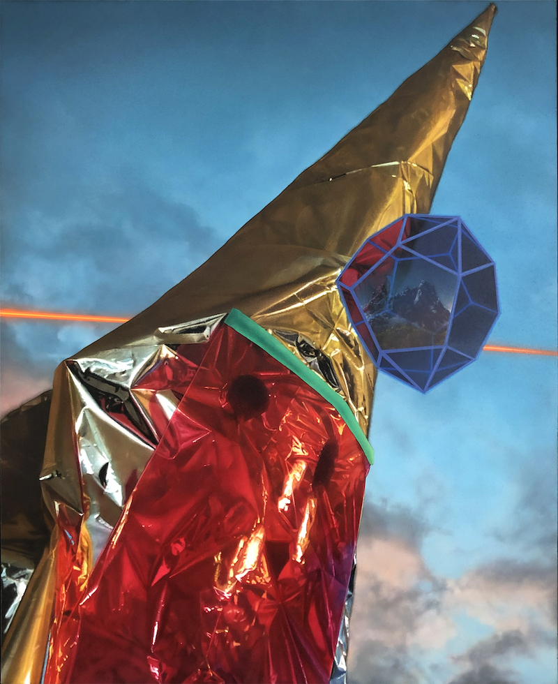 Certain works in the show come with additional context, such as the explanation for the Jacobson piece below: “Translated from ancient Sumerian: ‘face of the spectre and reaching the mountain imprisoned inside the dark glowing chamber.’ Jacobsen uses varieties of religious iconography to express universal mystical ideas. In this case he uses the Capriote headgear used by certain Spanish Catholics sects, to hide the identity of a penitent and remorseful fallen angel depicted in this piece.”