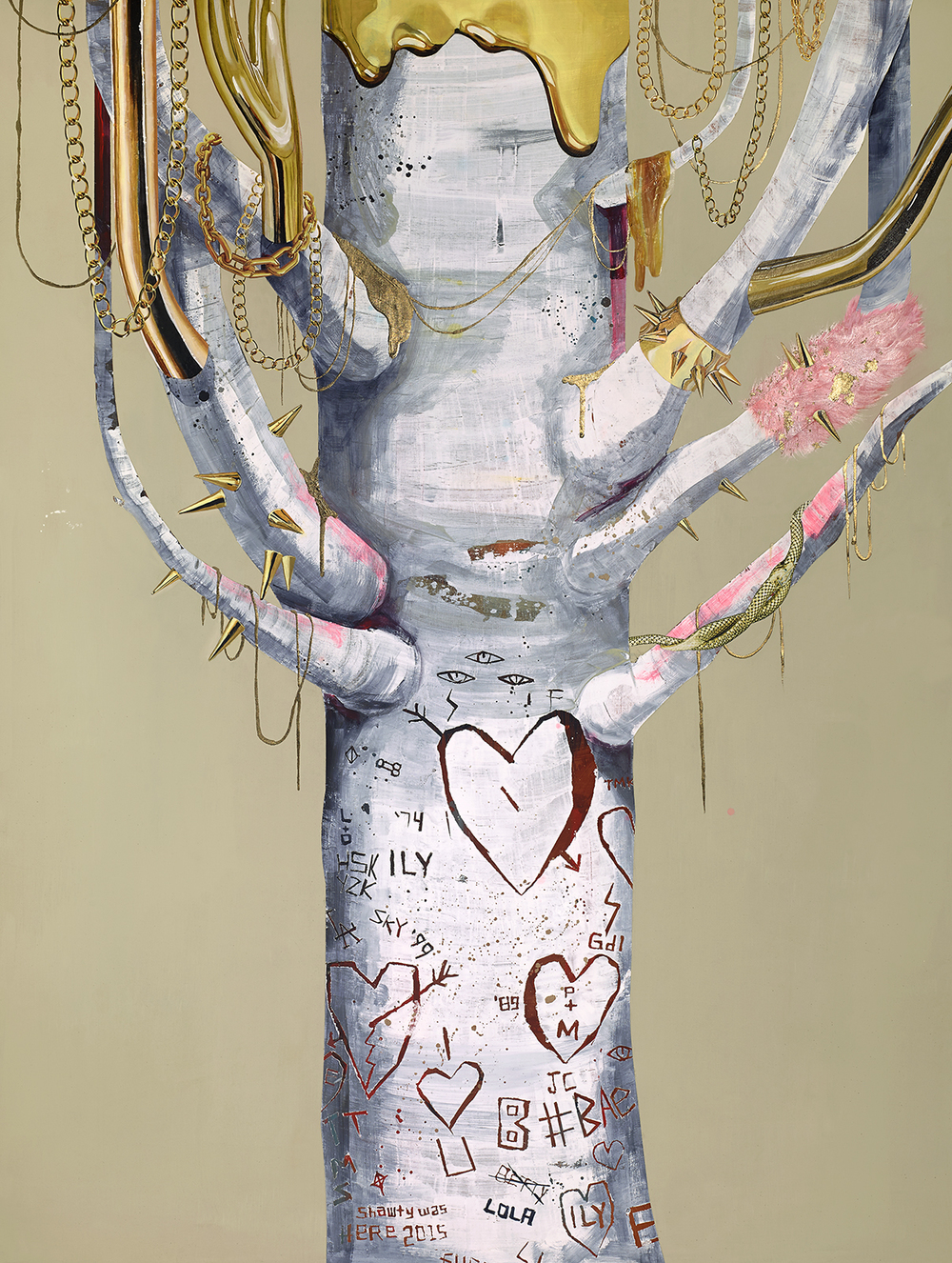 “As a mom of two teenage girls at this point in my life, I often try to imagine life through their eyes,” the artist says. “Life through selfies. Quantity over quality. Instant vs. delayed gratification. Yosemite vs. the mall. As we get more and more inundated with the STUFF of life, the hundreds of thousands of $2.80 jewelry pieces at Forever 21, the never ending abyss of images of the internet … I’m exploring what it is like to just BE in this time of ‘life online’– our projected selves. I am interested in the dichotomy of our inner life vs. our outer life.”