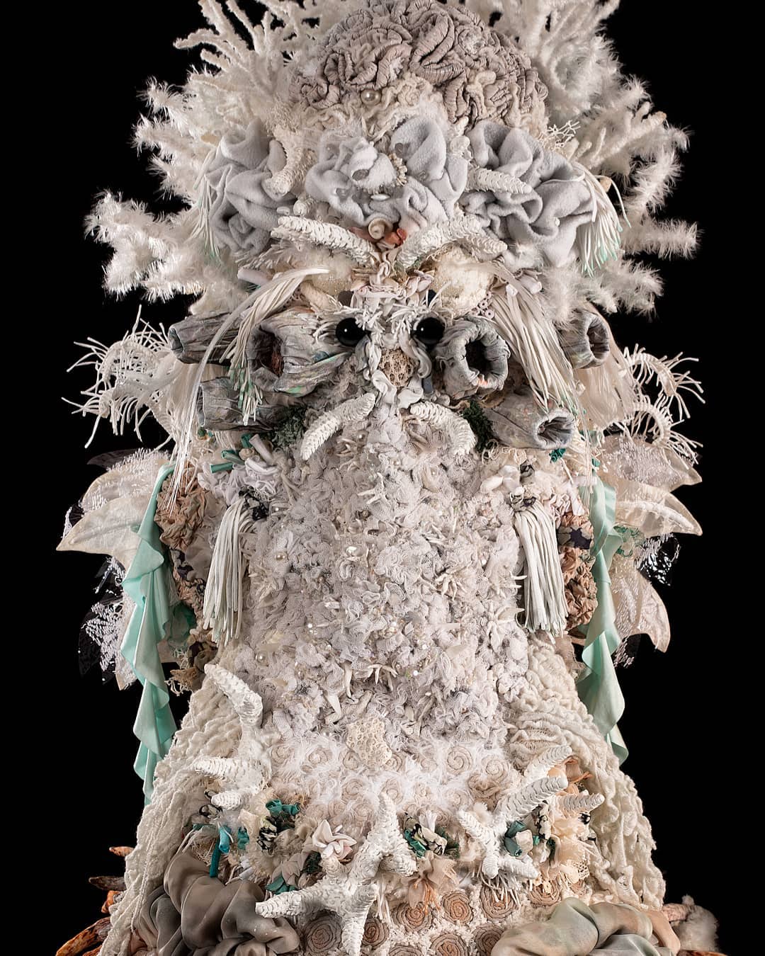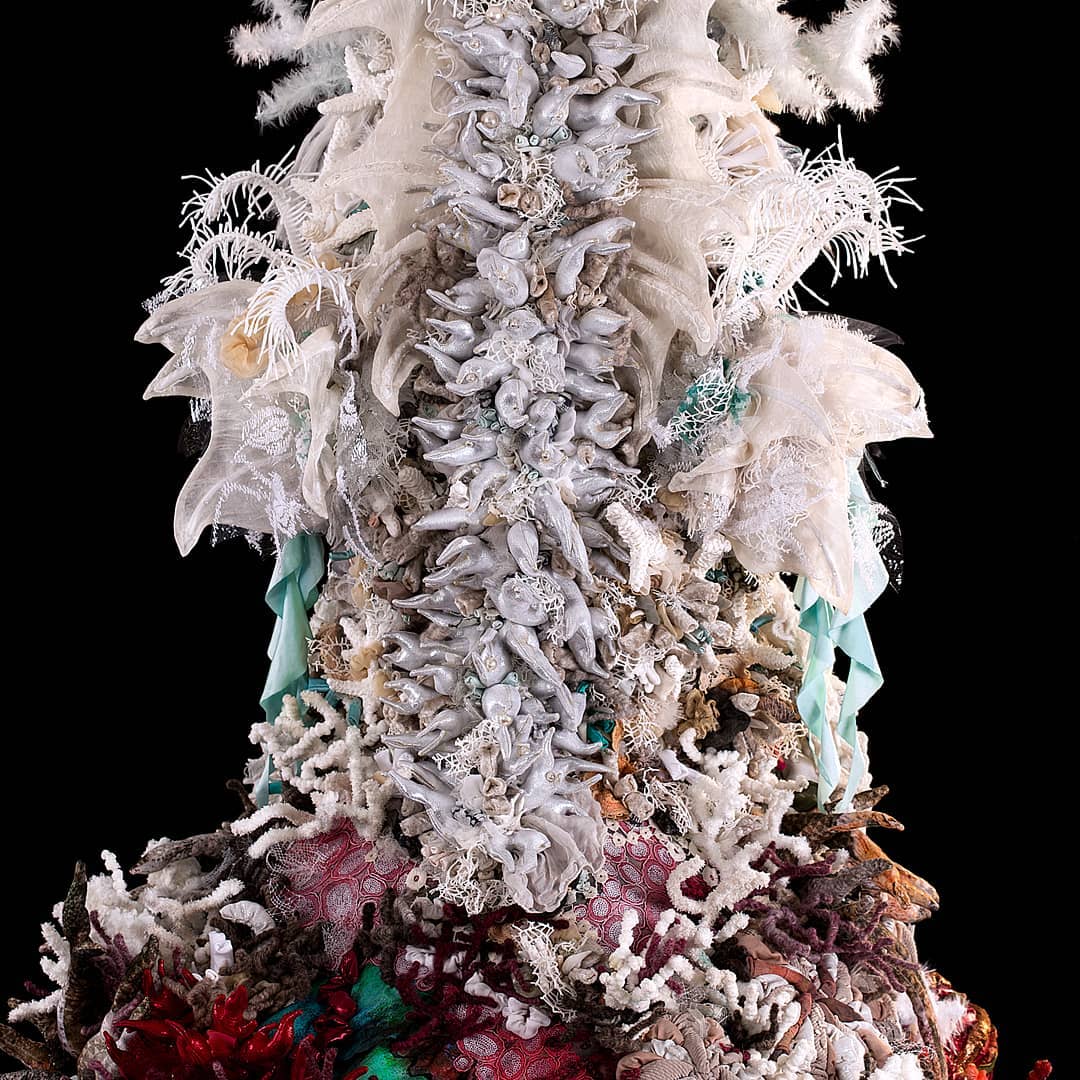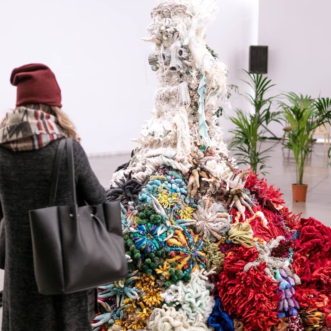 Paola Idrontino‘s massive textile sculpture “Evanescent” depicts the scourge of coral bleaching in the world’s oceans, brought on by climate change. The work, which took years to complete, was recently on display at Museu del Disseny de Barcelona. Idrontino’s practice includes textiles, wearable art, and photography.