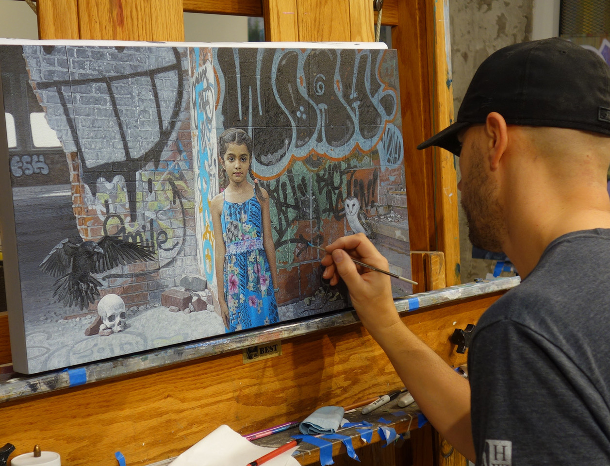 “In spite of seemingly bleak, if not potentially catastrophic, circumstances, the isolated child protagonists in Peterson’s works, bereft amidst modern-day ruins save for the companionship of their wild, bestial cohort, are calm, peaceful, and strangely emancipated,” Thinkspace says. “A feeling of persistence and salvage dominate these visual metaphors for human survival; life, in the end, persists in its way and under the most iniquitous and impossible conditions.”