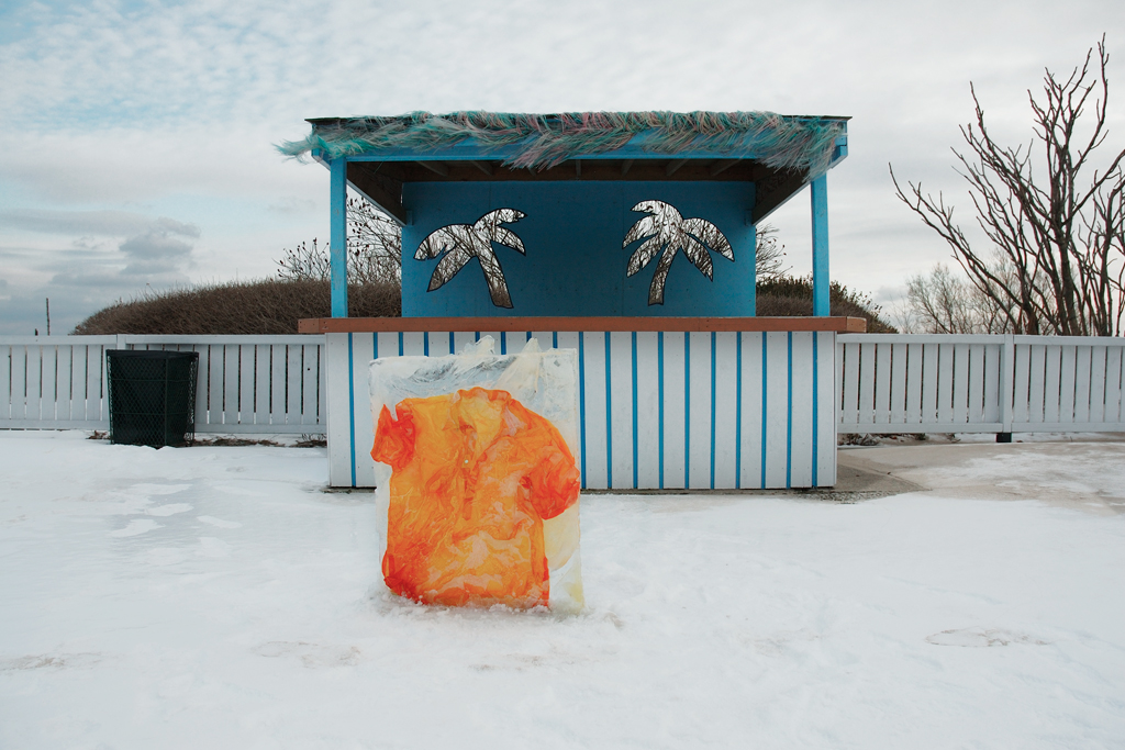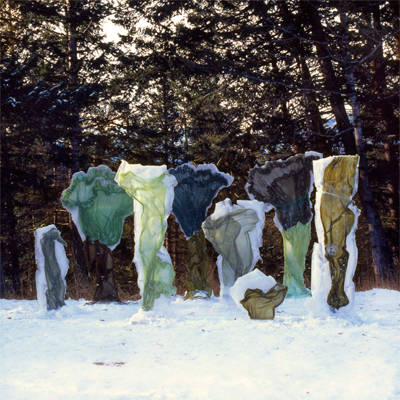On the piece “Bouquet,” in particular: “This outdoor installation of ice-covered dresses was created to resemble an alluring bouquet of fantastical plant life summoned from the underworld. It appears out of the frozen earth like the mythical man eating trees of folk fiction. It has more in common with the Venus flytrap than the Valentine sentiment. In addition, the presence of women’s clothing also refers to the deep seated fear of the Man-eating female in science fiction and pagan myth.”