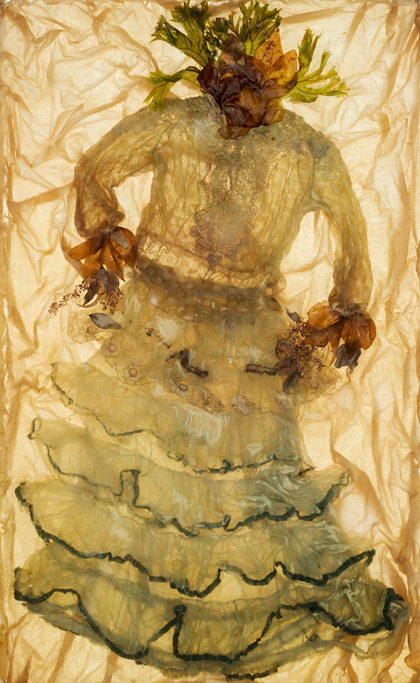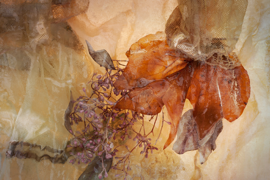 The frozen textiles in the outdoor installations of Nicole Dextras appear as reflections of the natural world. In her “IceShifts” series, her process has a particularly Victorian effect, as she replaces the head and extremities of a human with plant matter. The result is both haunting and elegant.