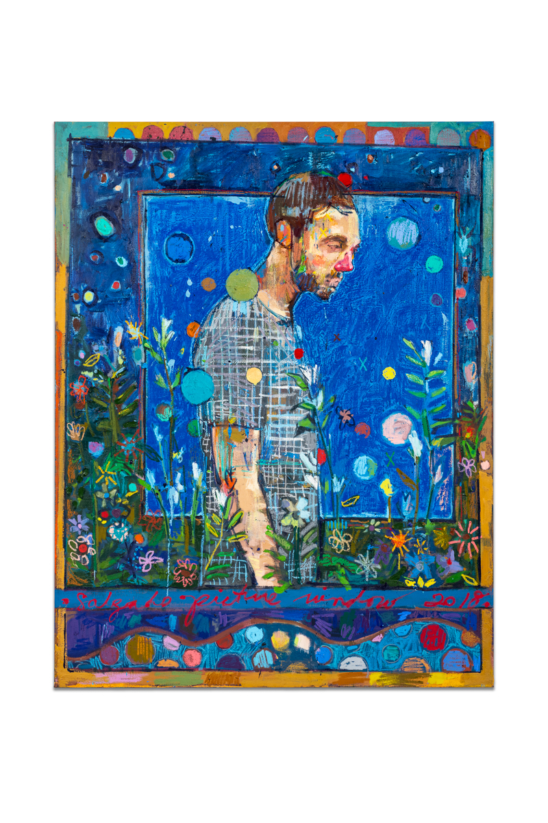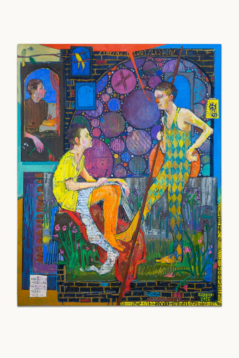 “Andrew Salgado’s paintings have evolved greatly in style since first rising to prominence over half a decade ago with his (then) signature large-scale, painterly portraits, where large swathes of colour played across the surface to define his subjects,” a statement says. “In his most recent work – the representational has given way to the more abstract: and now such colourful, symbolic, and compositional elements are the driving force of the painted image. While the figures remains a common thread –today Salgado’s subjects are depicted in a fantastical, often ominous tableaux … ”