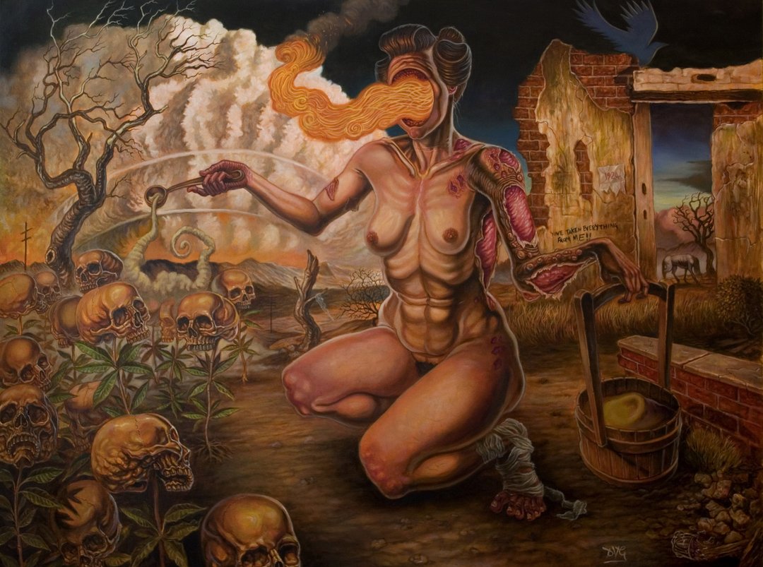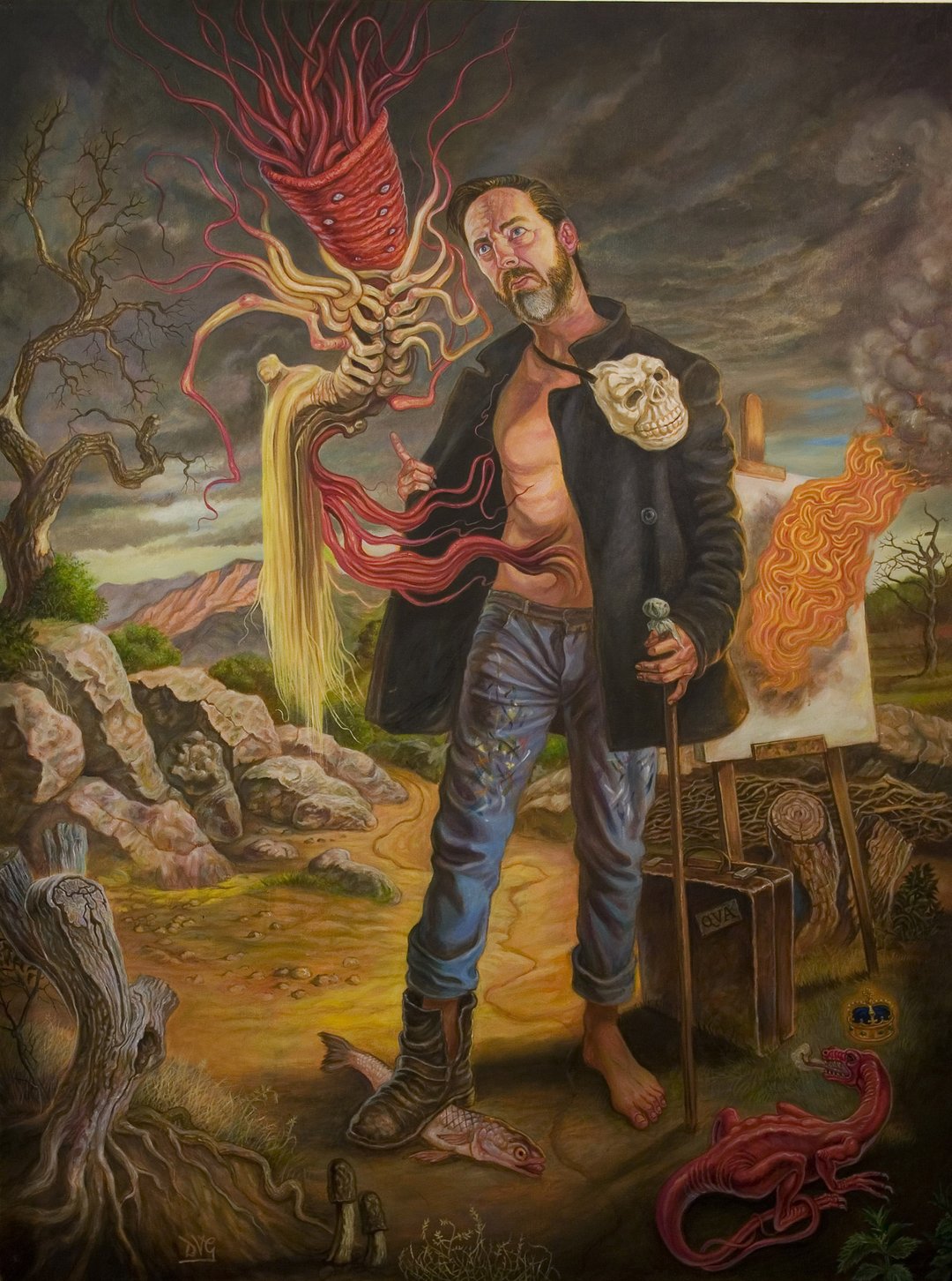 “Necrosurrealist” David Van Gough offers a new body of work that pulls from literary and Biblical narratives in “Paradiso’s Fall.” Kicking off today at Dark Art Emporium, several new paintings comprise this series. Each painting is dense in both its creatures and references to the cultural touchstones that influence the artist.