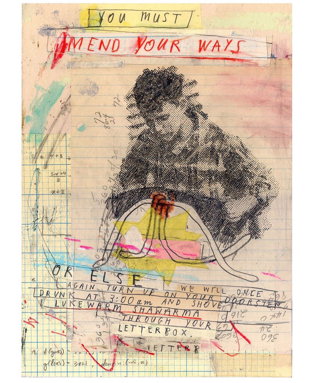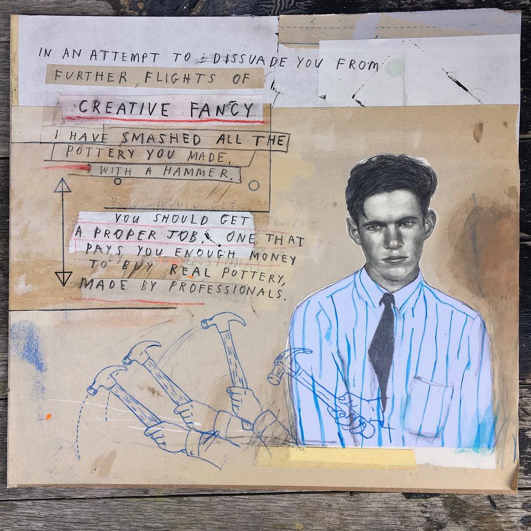 “He inhabits a dingy studio filled with half empty notebooks, scraps of paper covered in scribbled phrases and other random ephemera that he incorporates into his artwork,” a statement says. “These elements represent the often overlooked stuff of daily life , which is the root of Mr Fullarton’s inspiration. He sees beauty in the ways people manage to find joy and meaning in the minutiae.”