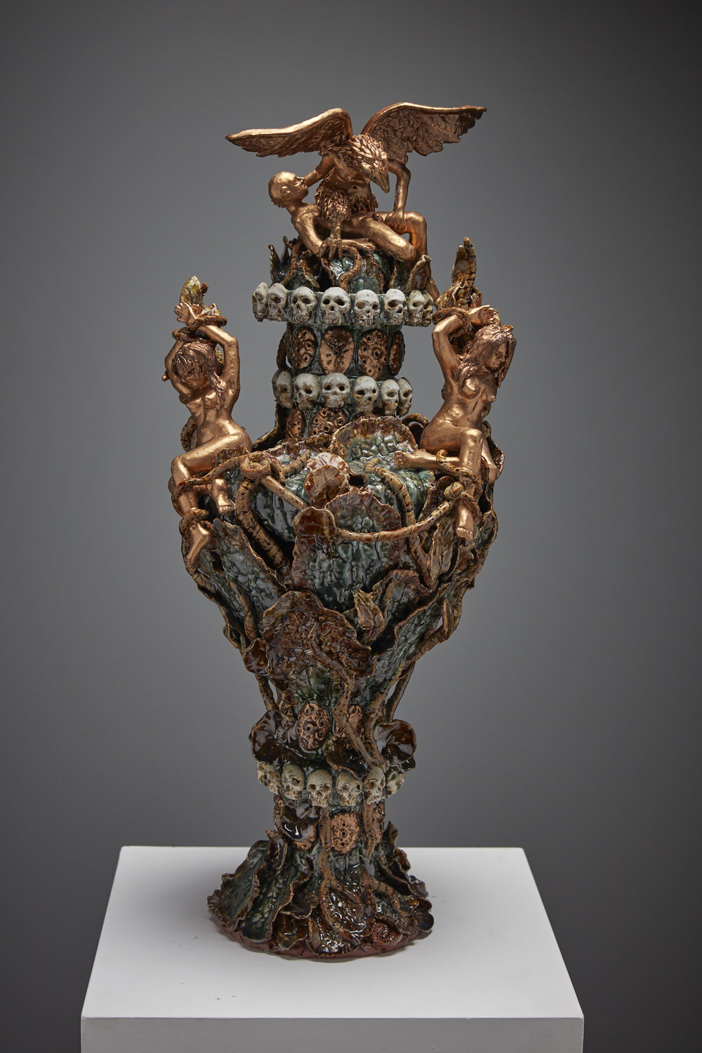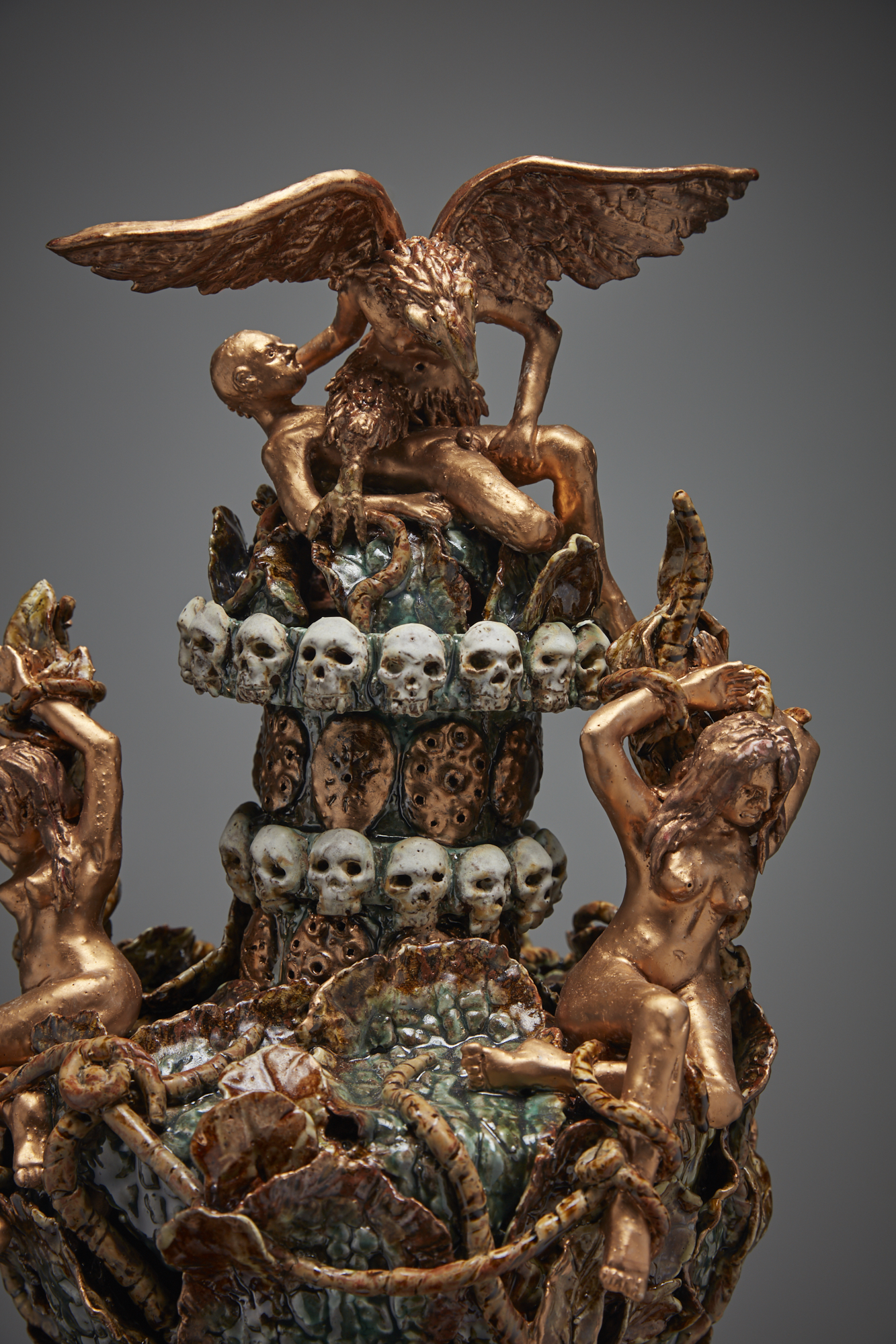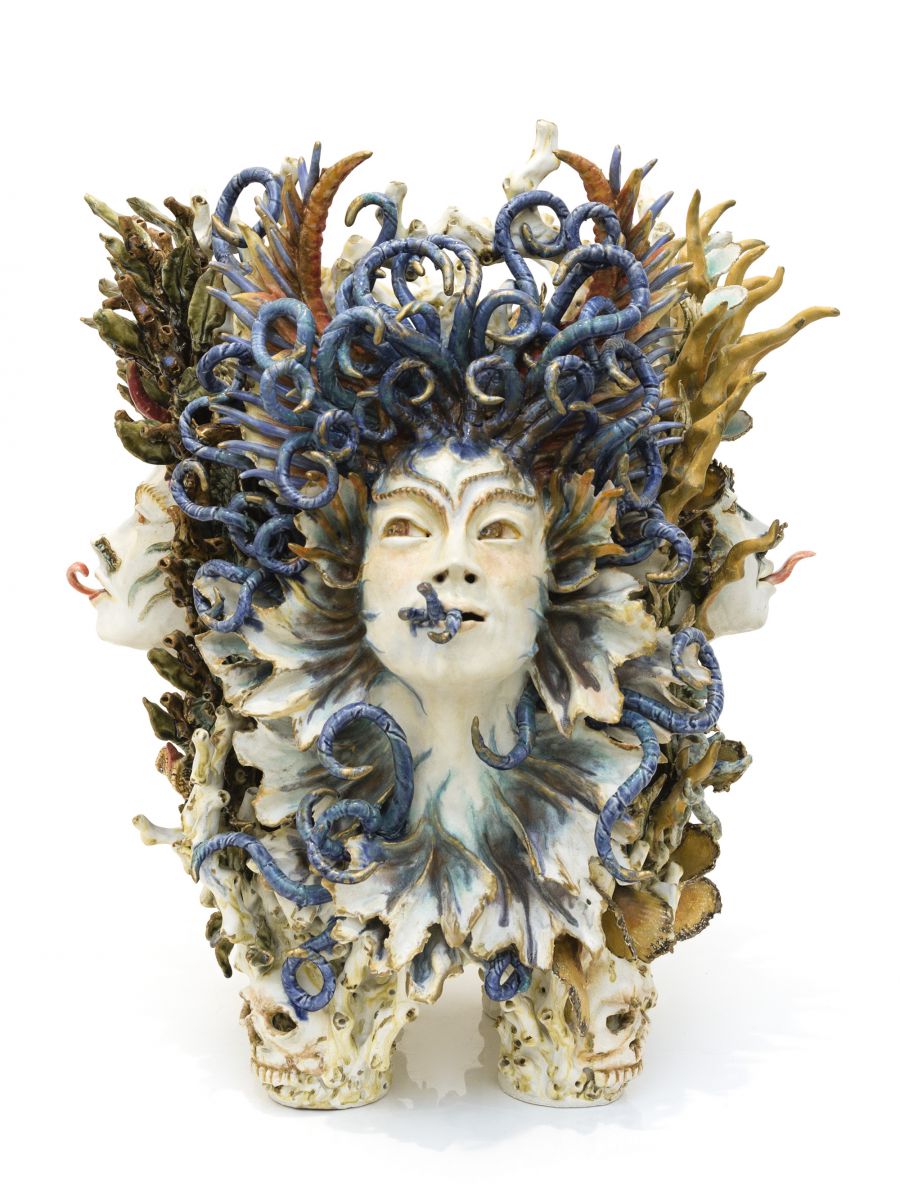 “Each delicate layer of detail materialises a less familiar world beyond the realm of appearances, challenging the viewer’s perception of reality,” Arthouse Gallery says. “From macabre worm-adorned women and memento mori skulls to oriental pseudo-gods, exotic snake charmers and native Australian flora, the works are at once beautiful and enthralling, confronting and disturbing. Ultimately, these masterful ceramics are poetic tropes for the artist’s personal reality and emblematic expressions of the wondrous world around us.”