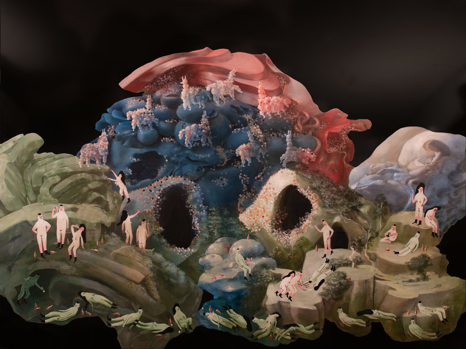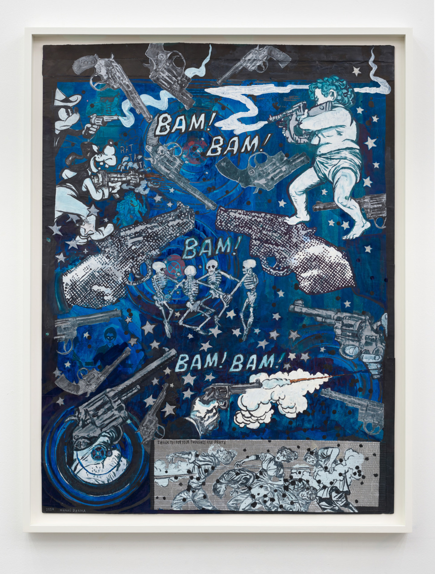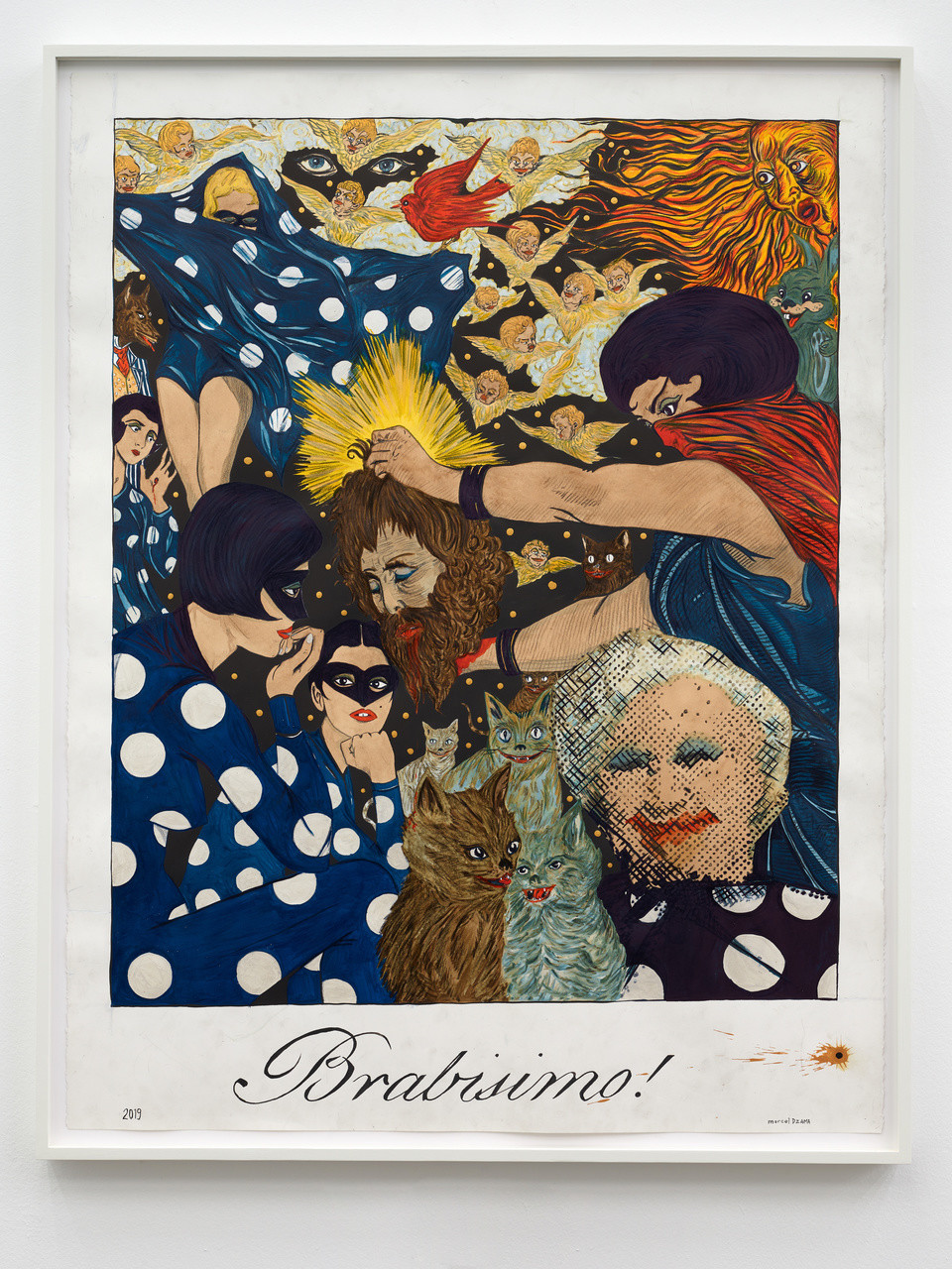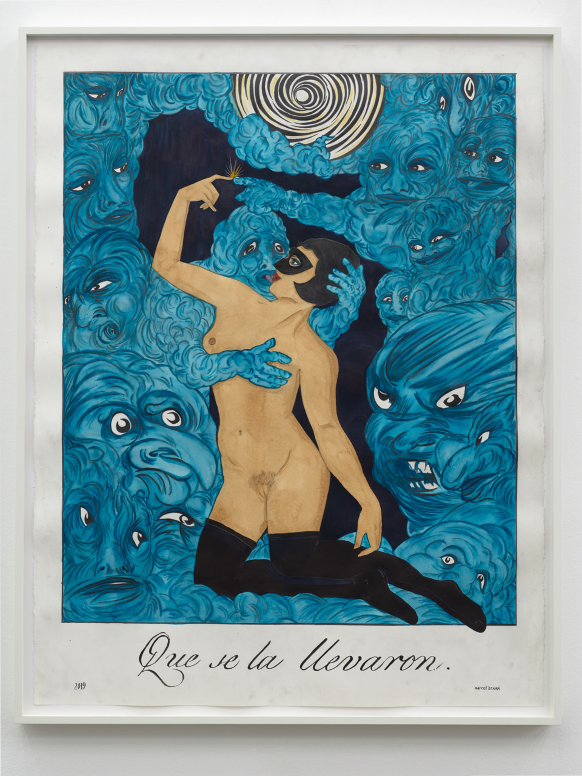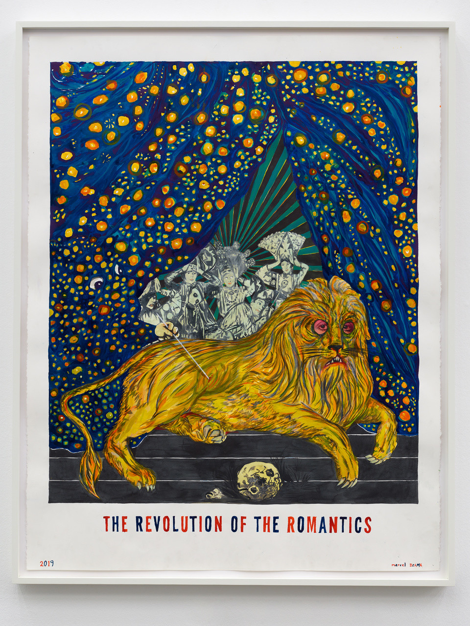 “Dzama’s image repertoire includes a wide range of art-historical quotations,” the gallery says. “One can recognize ballet costumes by Oskar Schlemmer or Francis Picabia, for example, and direct references to Francisco de Goya, Marcel Duchamp, Joseph Beuys or Sigmar Polke. Embedded text fragments contain quotes from William Blake or Rainer Maria Rilke. However, it’s not just elements from the past that spur Dzama’s creativity. The music enthusiast has collaborated with various colleagues from the beginning of his career, whether as part of the Royal Art Lodge in Winnipeg, which he co-founded, or in the form of collaborations with members of the band Arcade Fire, the musician Kim Gordon (Sonic Youth), the filmmaker Spike Jonze, the actress Amy Sedaris, the ensemble of the New York City Ballet, or fellow artists like Jockum Nordström.”