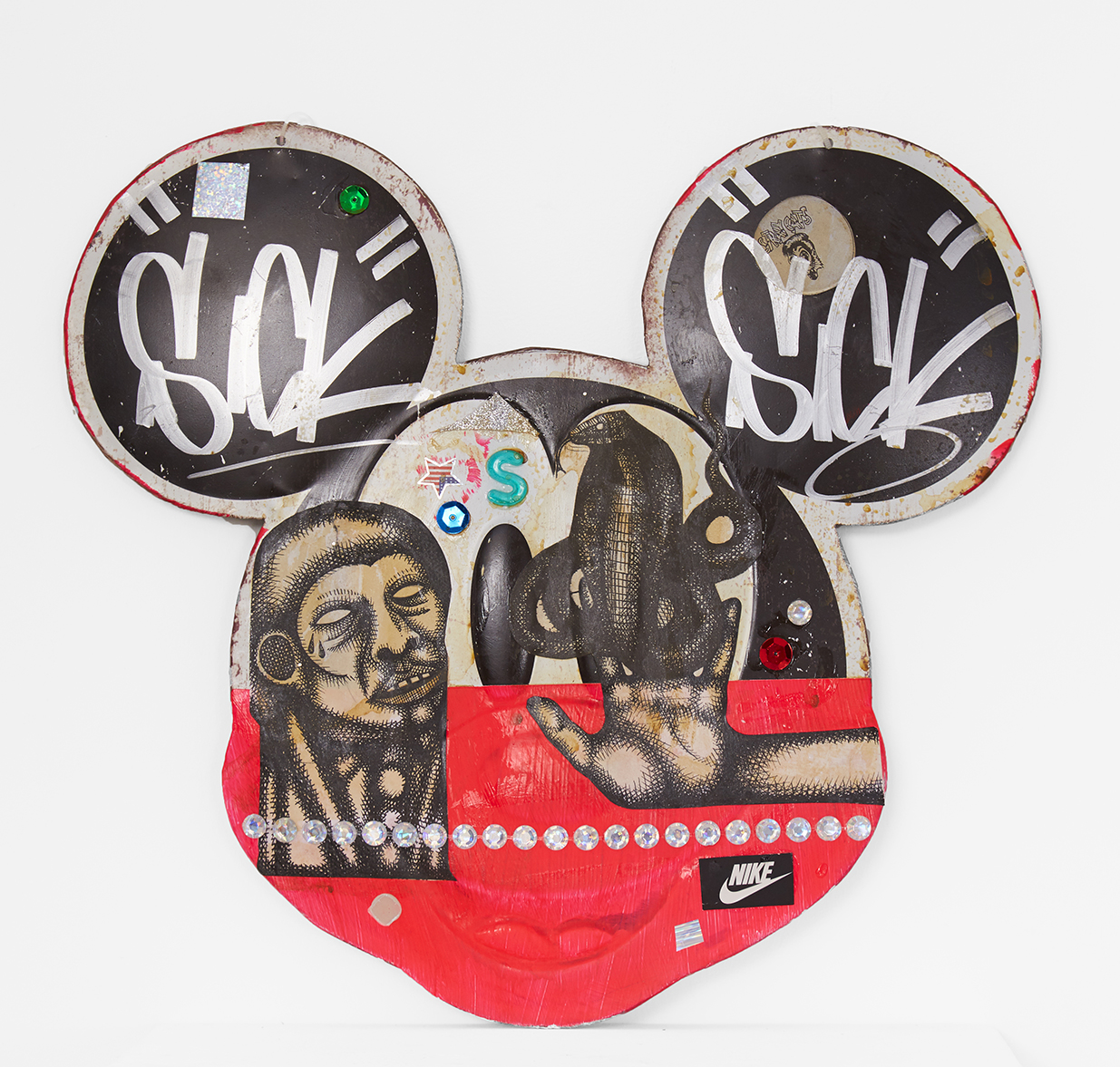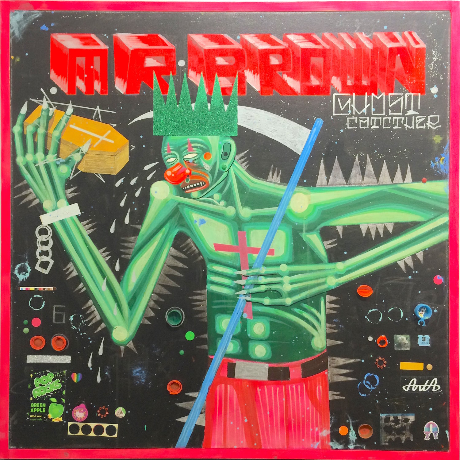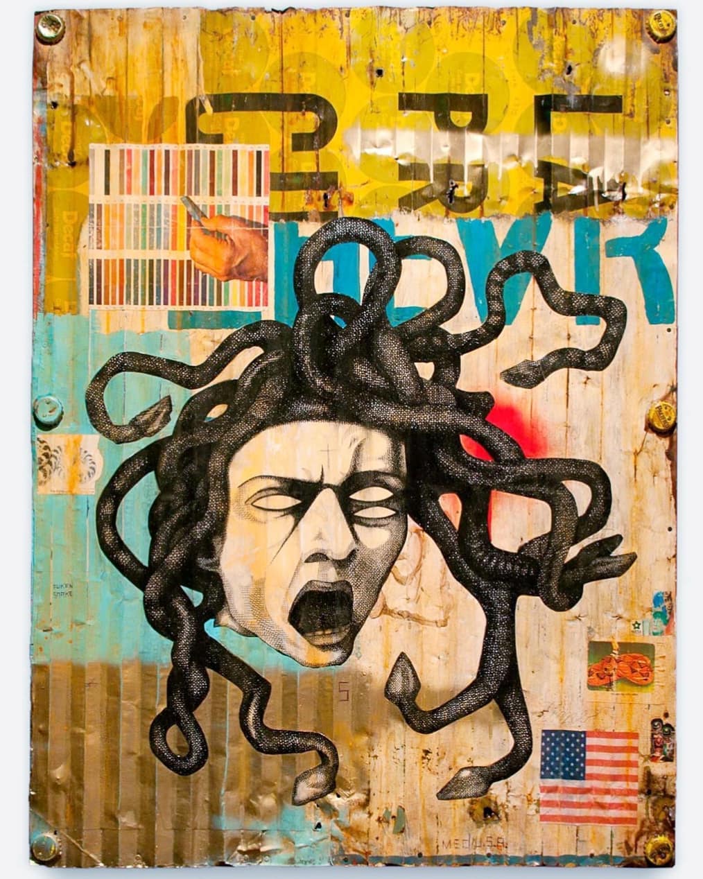 “His work is tremendously resourceful, scavenging abandoned desert environs for creative materials such as discarded signs, wood, and corrugated metal that he reconfigures, often juxtaposing pirated images and text with his original artwork and collaged elements,” his site says. “The work is replete with layers and textures intertwined with the political while being disguised as popular. Works include a combination of house paint, sparkly stickers, handwritten bilingual text, rusted bottle caps, discarded packaging, and an iconic stylized use of acrylic paint with deeply layered figurative workings.”