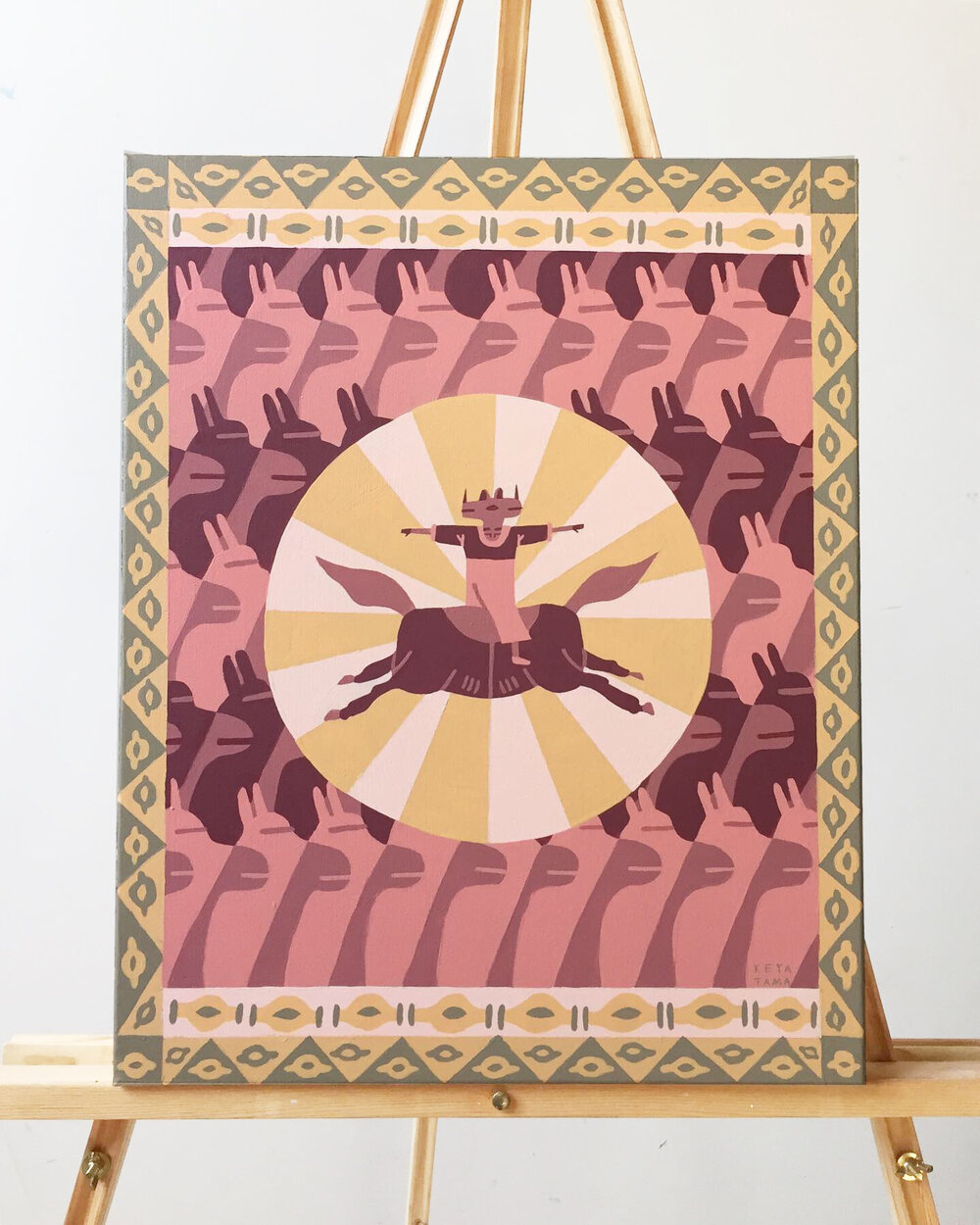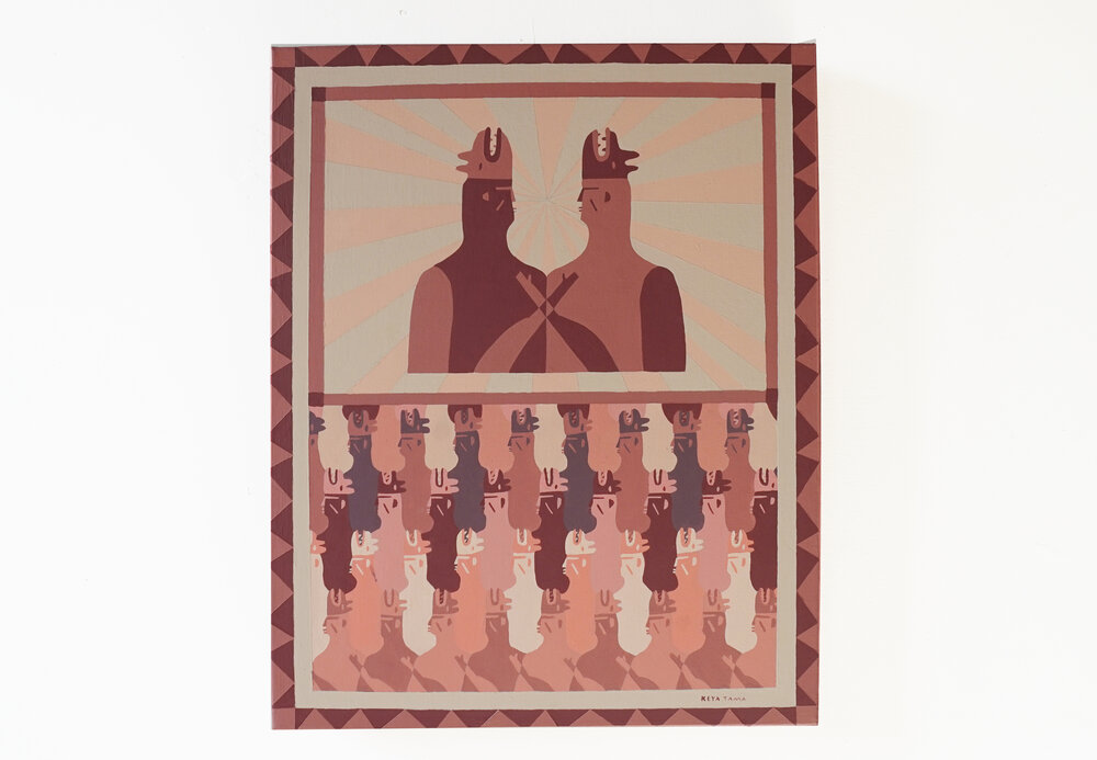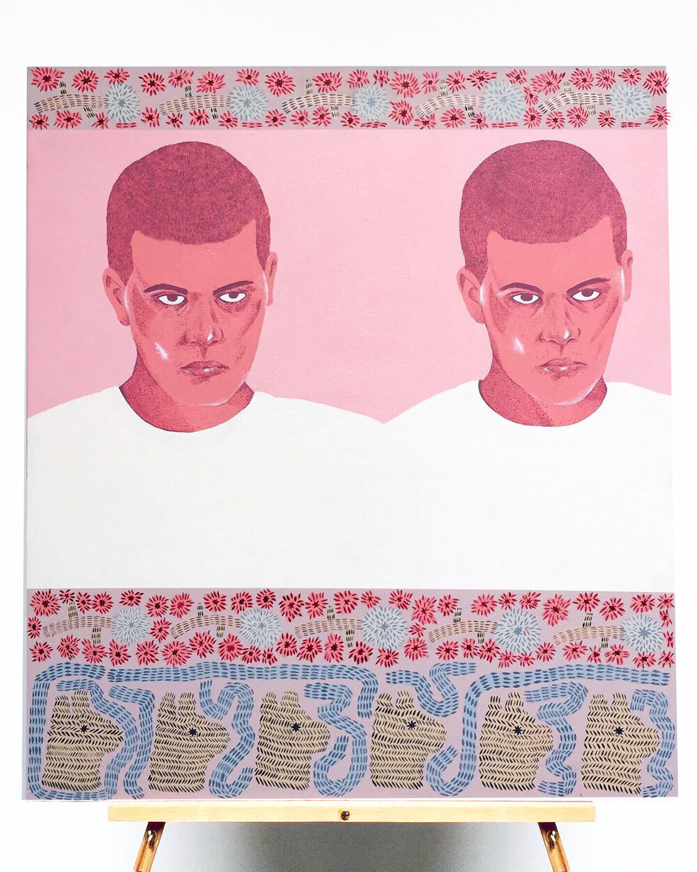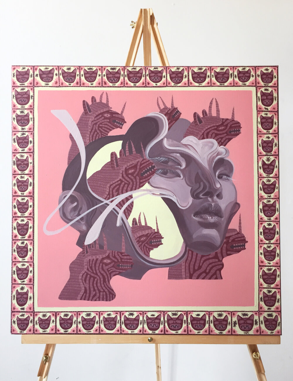 Keya Tama is a South African artist who says he aims to “reunite old and new through contrasting yet unified iconography.” Tama’s talent for crafting interlocking creatures, either in the backgrounds of his paintings or in the form of murals, also recalls the work of M.C. Escher. Recently, the Los Angeles-based artist has also been collaborating with others in his pieces, such as the work with Caratoes below.