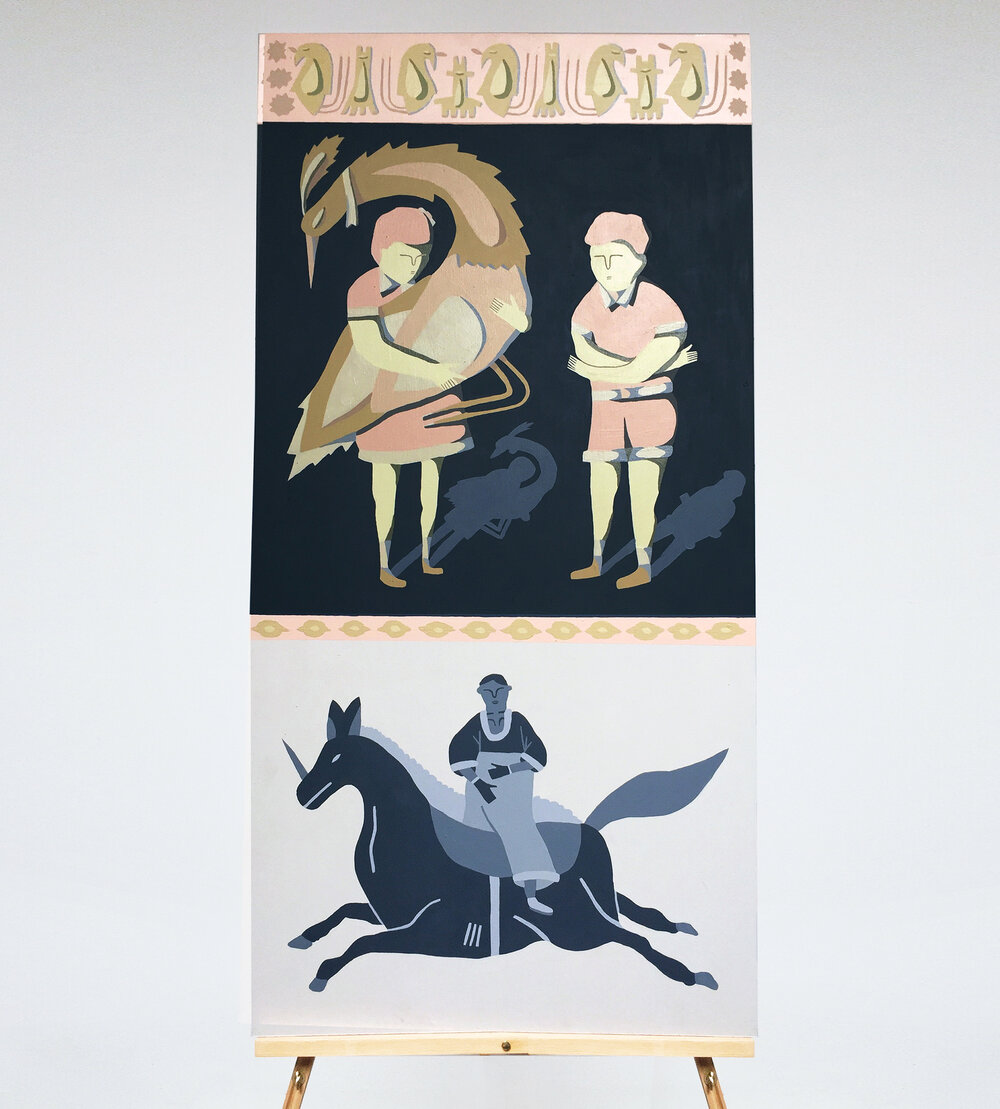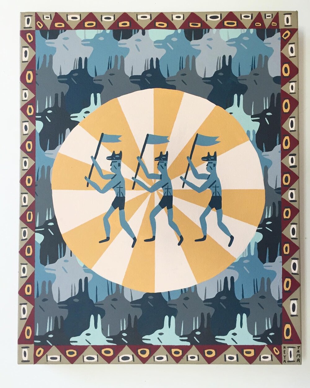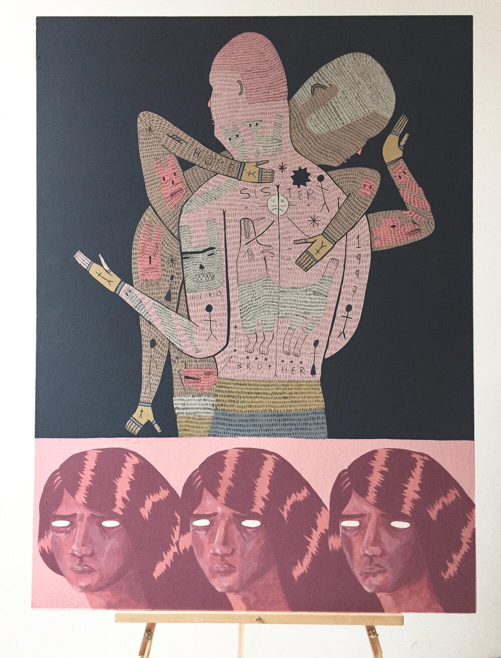 Keya Tama is a South African artist who says he aims to “reunite old and new through contrasting yet unified iconography.” Tama’s talent for crafting interlocking creatures, either in the backgrounds of his paintings or in the form of murals, also recalls the work of M.C. Escher. Recently, the Los Angeles-based artist has also been collaborating with others in his pieces, such as the work with Caratoes below.