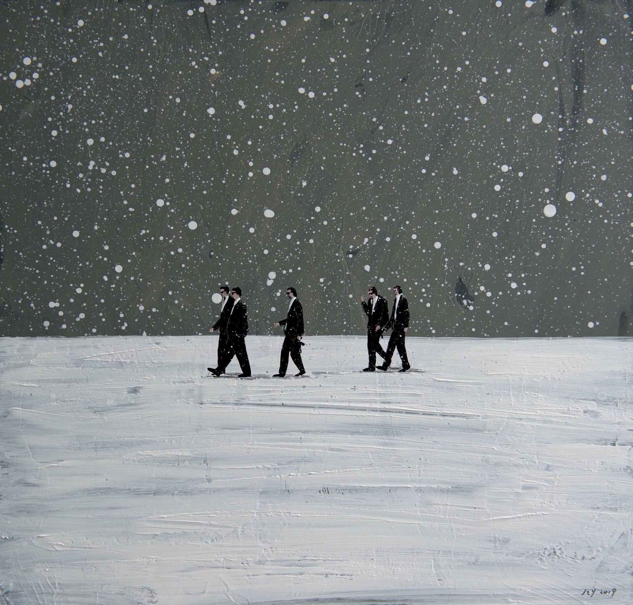 Zhiyong Jing says he paints “dreams, bodies and absurd realities.” The Beijing-based artist takes a surprising approach to scale in his work, often rendering distant figures on small canvases. The effect is cinematic, further underscored by the artist’s occasional use of pop culture references and characters.