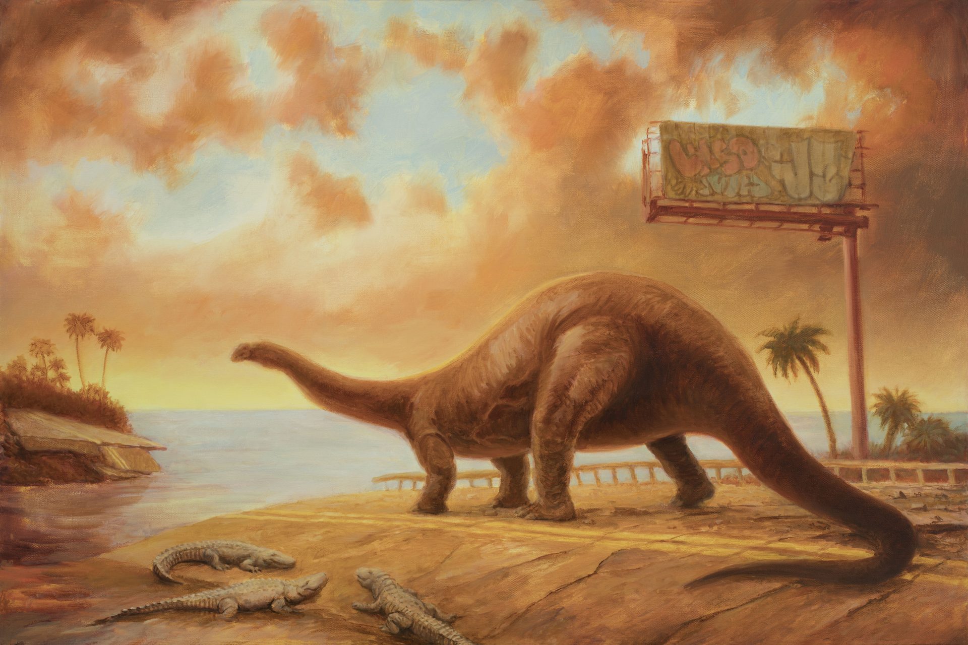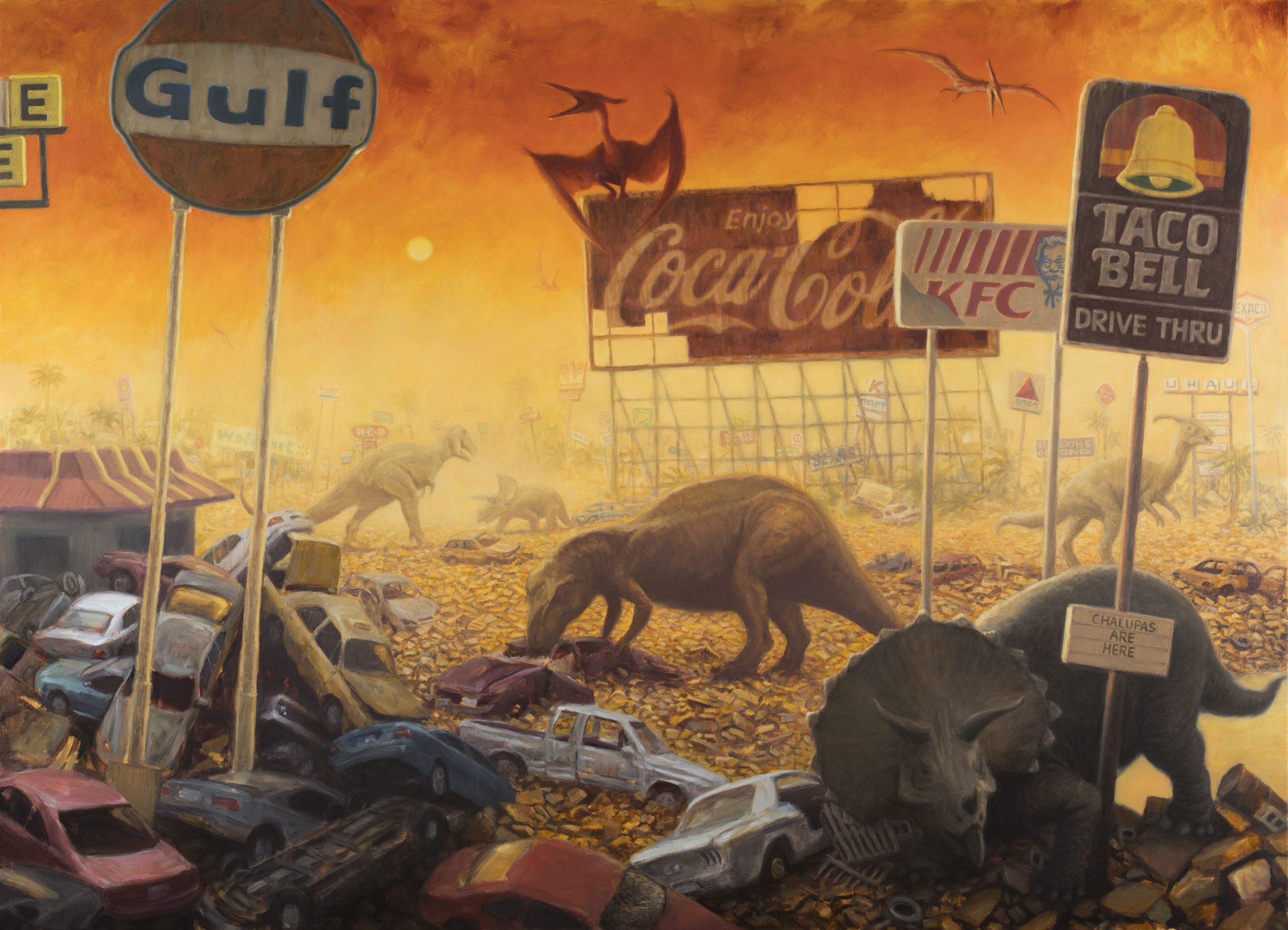 Bring on the Dinosaurs! It’s hard not to notice the prevailing dinosaur in your latest body of work. Coupled with a dystopian near-future, these enormous creatures are seen stomping their way through iconic capitalistic symbols, including gas stations…