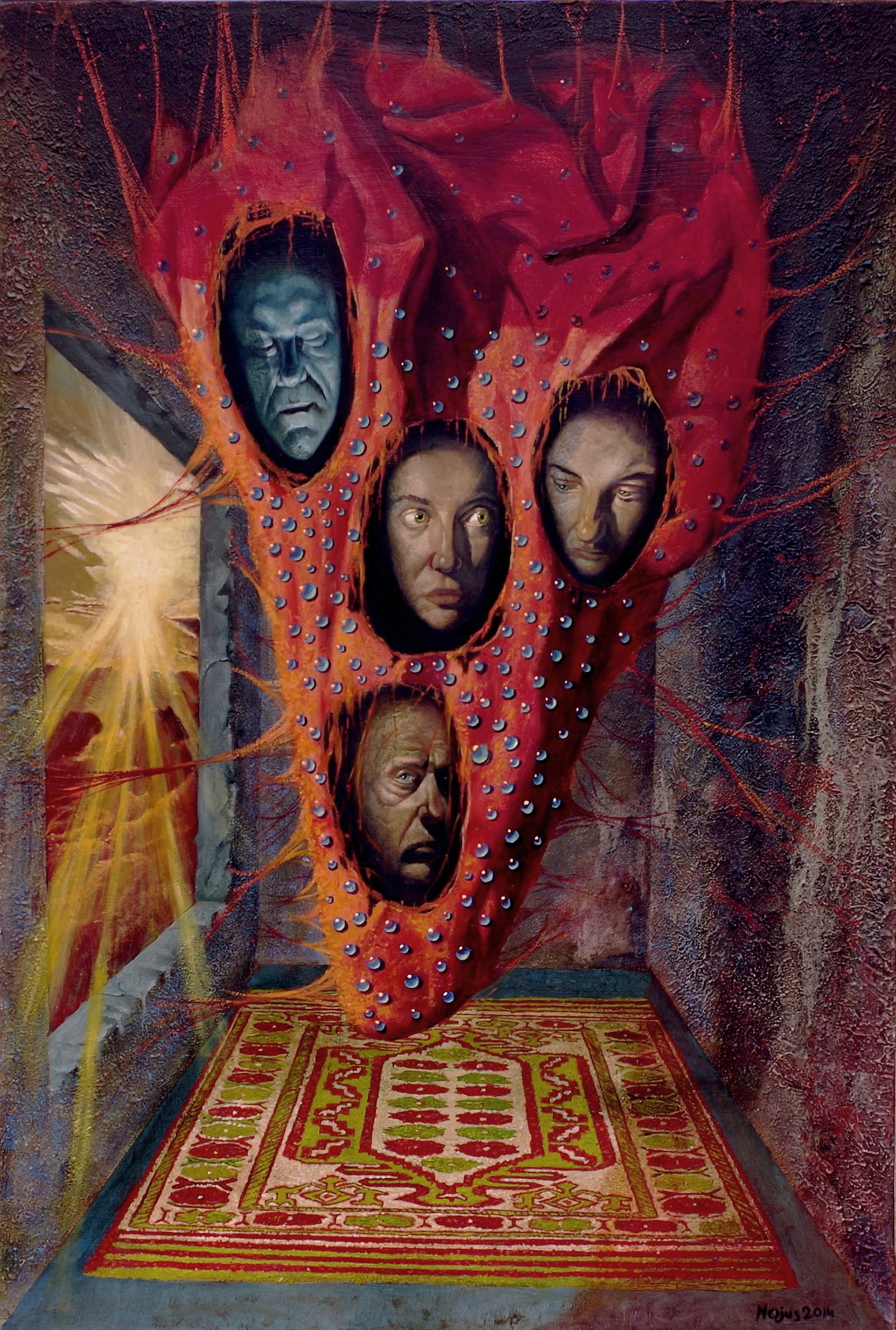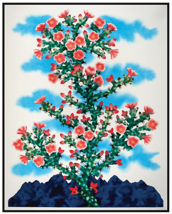 Contrasting Palladino’s bedroom scenes are his distinct botanical portraits, which are acutely textured, yet simultaneously soft and dreamy, all in his characteristic whimsy-psych style. These paintings exalt varieties of the cacti family, their fleshy folds rippling out in hallucinogenic splendor. Palladino and his wife have lived in La Paz for the past five years. Part of the Andes mountain range and the highest capital city in the world, they’ve existed among the incredible abundance of cacti and succulent plants that thrive there. The San Pedro plant—native to the Andes—grows through “cresting,” a response to mutations, infections, or damage that creates a brain-like growth pattern. This plant has become a muse for Palladino. Of this odd and mesmerizing story of growth, he shares, “I began playing at ‘growing,’ or designing, my own versions, and they began to take on an almost spiritual feel, like meeting an old forgotten god, something ancient and wise and mysterious. Then of course the surroundings of this place, the arid mountains, and the sky—which seems very dramatic and close to you— became another frame around the plants.”
