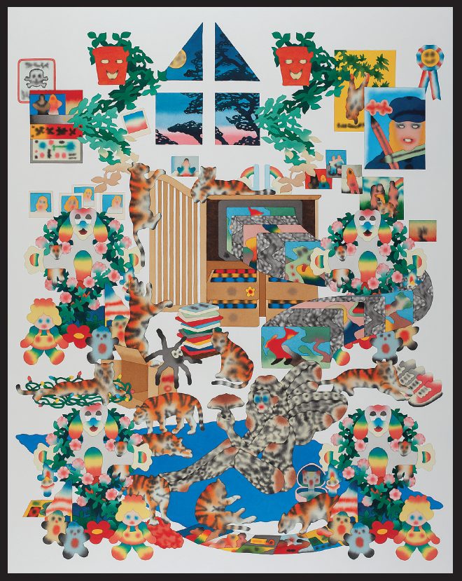 Palladino’s creativity doesn’t end there, as many of his ideas make their way into the material realm as tactile wall reliefs, through resin or hand painted 3-D prints. These might include elements similarly found in his paintings—things like funny felines, rainbow ribbons, and candy-like florals.