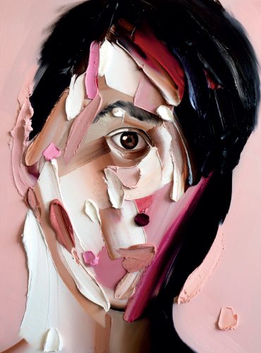 More recent works allow the thick strokes of paint to cover more of the face. Sometimes, it’s an eye or a nose or mouth that remains visible. Other times, it’s little more than a head of hair.