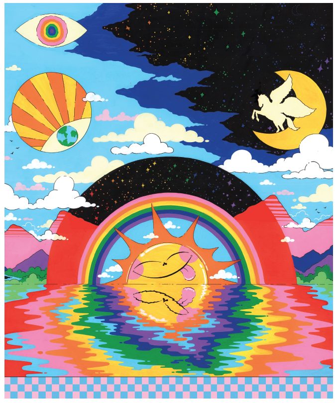 The realities that Hattie Stewart manifests have a carnival quality—gleaming, trashy fun with a slightly sinister undertone like golden midway tokens that rust and then jingle in your hand like they are laughing at you for believing the gold was real anyway. “Nothing brings me more joy,” Stewart says, “than taking a clean blank page and filling every inch of it with colors and imagined worlds.”