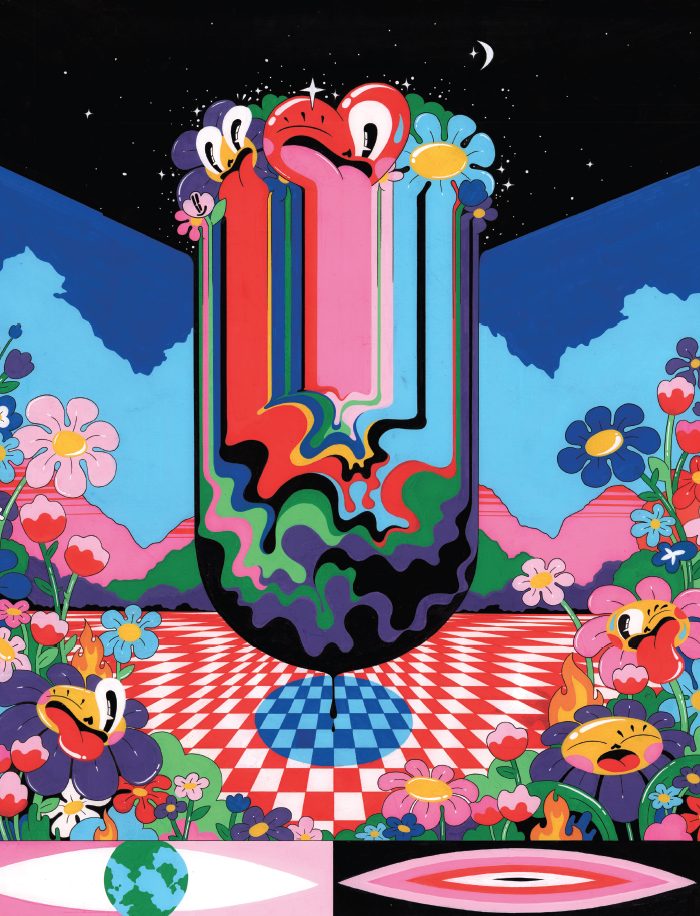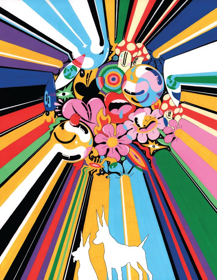 Checkerboards and stripes proliferate, as do wide-grinning hearts and bubbly-eyed devils clad in high heels (because, as she explains, trainers are a little played out and so boring) as well as smiley faces. Just like her vast pool of influences, her style has evolved into something that seems to fuse myriad streams of thought. At once, it is psychedelic and cartoony (think Fleischer Studios’ rubber hose style) and totally surreal.