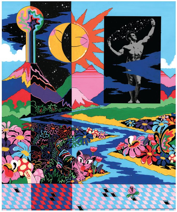 Stewart says, “I’m fascinated and intrigued by all forms of art and find great inspiration in every corner.” Examples of this inspiration vary wildly. Consider the following (and totally non-comprehensive) list: Hayao Miyazaki’s animated features; vintage pornography; and Martin Sharp’s acid-psychedelic cover for Cream’s album Disraeli Gears. The lattermost being “one of my biggest inspirations,” Stewart prayerfully intones.