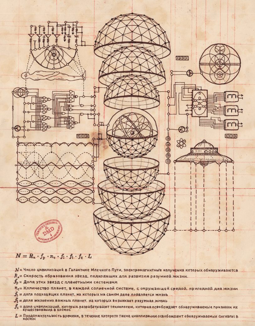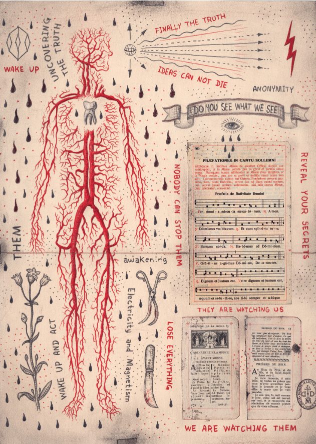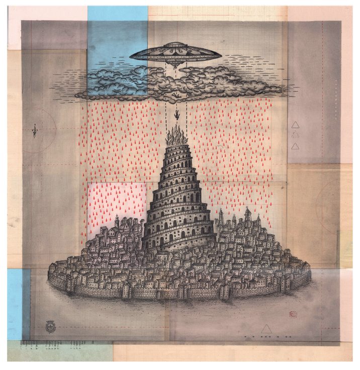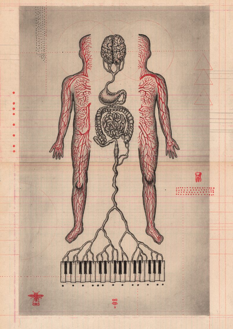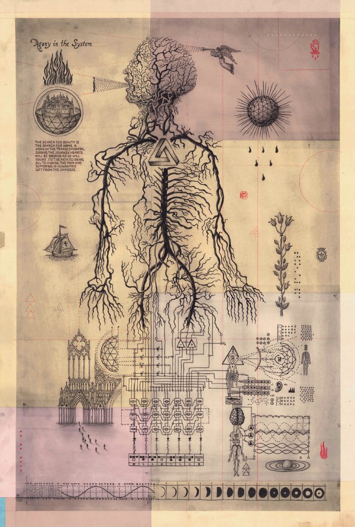 Diagrams and anatomy drawings are often components of Diaz’s pieces. And that’s where the mechanical drafting and architecture that he learned as a kid comes in handy. “In order to really show reality and to really show things in a scientific manner, they have to be done with precision,” he says. “They have to have that exactness to convey an idea.”