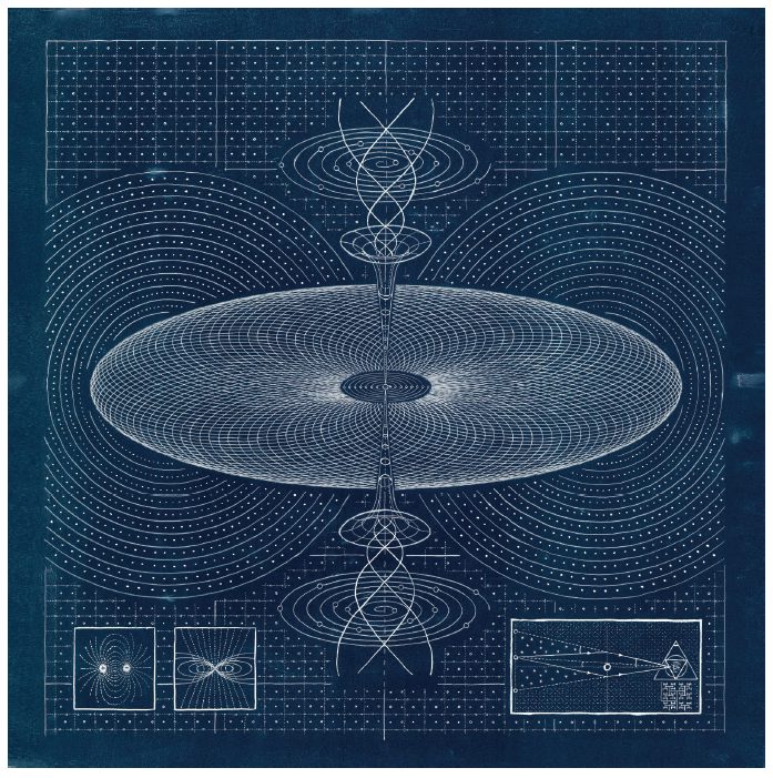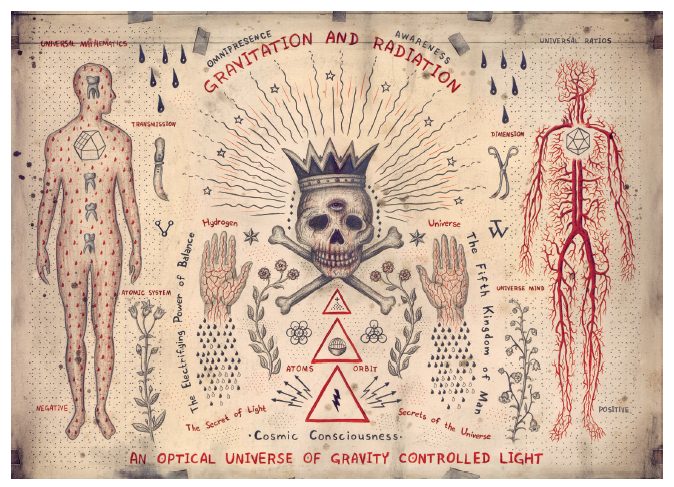 Diaz’s work often looks as if it was pulled from centuries-old books containing esoteric knowledge, although they are often filled with images that speak to modern audiences. Take “Music, Mind and Meaning” as an example. Diaz, who is also a musician and plays with the band Trees Speak, uses diagramming techniques that connect a keyboard to organ pipes. Through this, Diaz surmises that, while working intuitively, he was looked towards sound waves connecting with humans as well as merging “the electronic world with the analog world.”