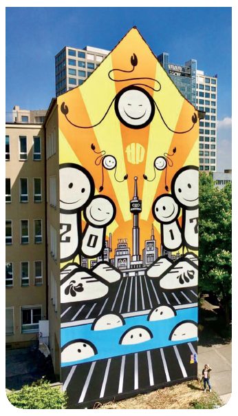 Recently, the London Police traveled to Charlotte, North Carolina to paint at Camp North End, the site of a former Ford factory. “They made the Model T car there in the early 1900s,” says Gibson. Later on, it was used as a manufacturing site for a military contractor. Now it’s being redeveloped as a shopping and business center. The London Police added their touch with Lads on a conveyor belt and other characters, like Tanksy and their Lad-styled dog, in the foreground.