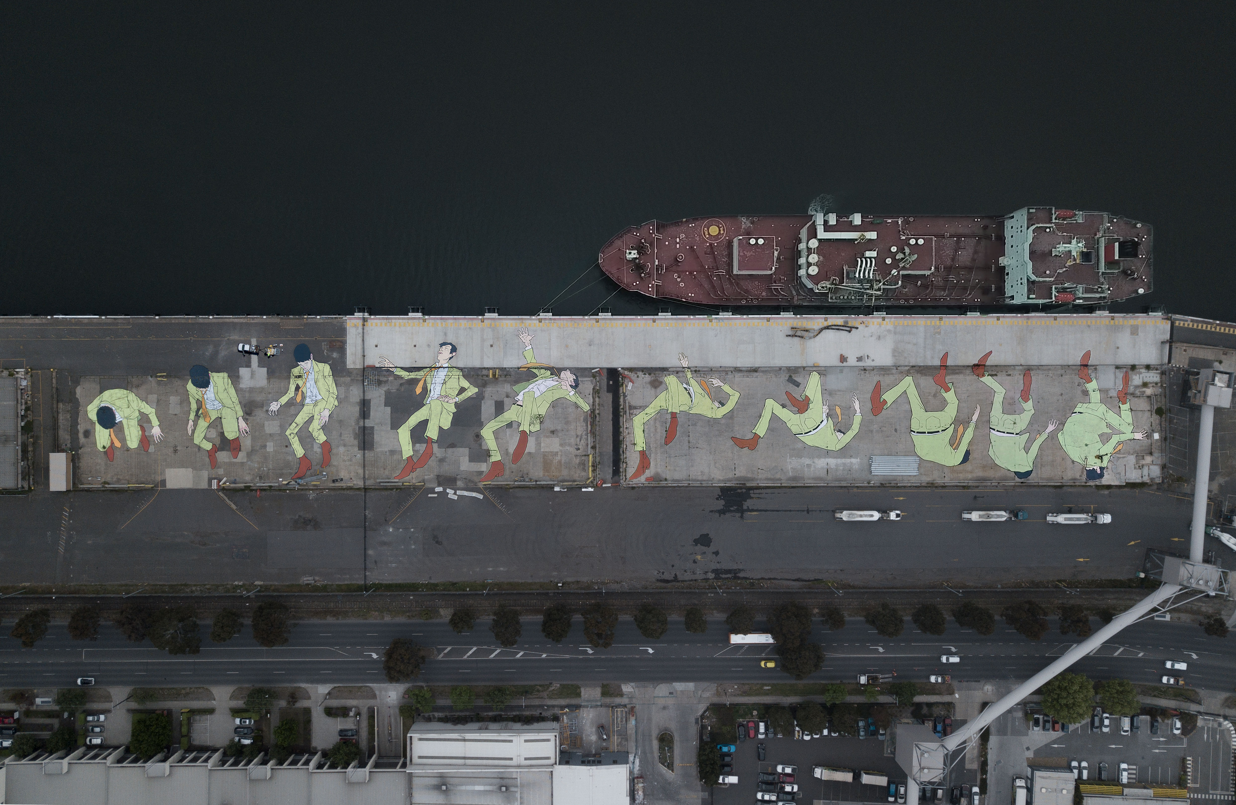 Kitt Bennett's "aerial mural work" was recently combined with satellite technology to craft the world's most massive independently created piece of "gif-iti" (or GIF-style graffiti) on 96,875-square-feet of waterfront space in Australia. The work, crafted by Bennett alongside collective Juddy Roller, features 10 figures that craft a "moving" scene when viewed as such below. Bennett was last featured on our site here.