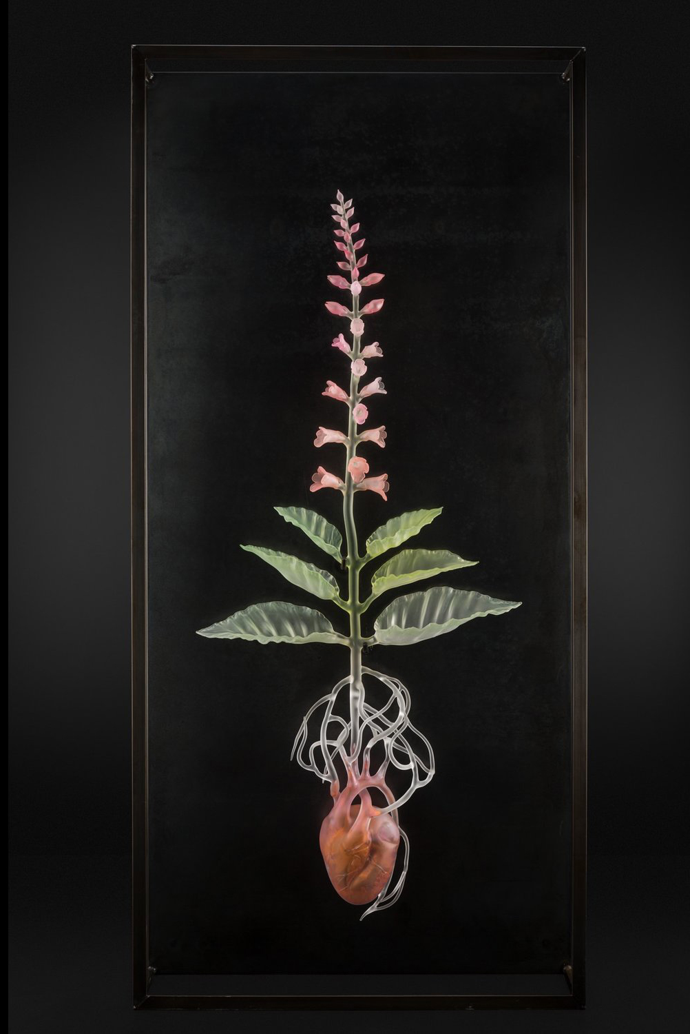 The glass work of Janis Miltenberger emulates natural forms, often blending human components with floral structures. The artist says she first crafts the internal structure of each piece, torching new elements into existence and adding to that foundation. Her works can take weeks or months to finish.